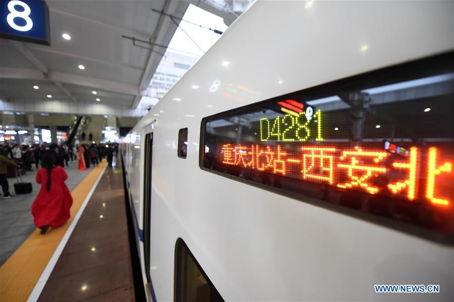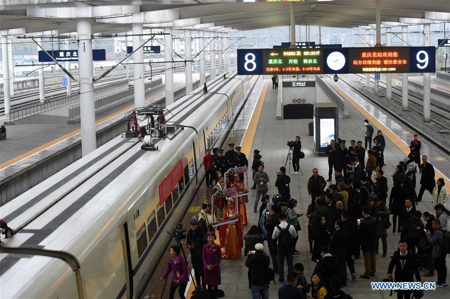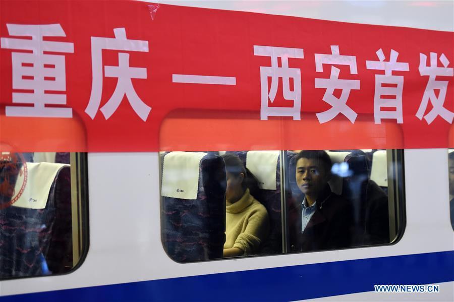 A policeman walks past a bullet train for Xi'an, capital of northwest China's Shaanxi Province, at the Chongqingbei Railway Station in southwest China's Chongqing Municipality, Dec. 6, 2017. High-speed trains linking Xi'an and Chongqing, began operation on Wednesday, slashing the travel time between the two cities from 9.5 hours to just 5.5. The new route includes a new section of the high-speed rail line linking Xi'an with Chengdu, capital of southwest China's Sichuan Province, which also started operation on Wednesday. (Xinhua/Tang Yi)