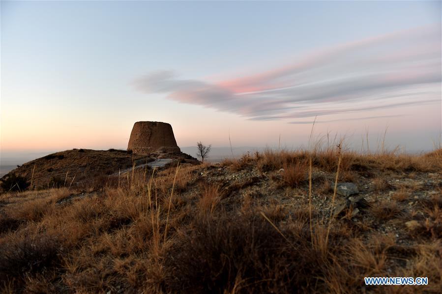 Photo taken on Dec. 5, 2017 shows the site of an arch door on the Guangwu Great Wall section built during the Ming Dynasty (1368-1644) in Shanyin County, north China's Shanxi Province. The arch door on the Great Wall was reduced to ruins after a strong gale in October last year. Now the reinforcements and repair work have been completed on the arch door site. The archway had been the remains of a former watchtower on the Guangwu Great Wall. It was called the "Moon Gate" by Great Wall aficionados due to its round shape. (Xinhua/Zhan Yan)