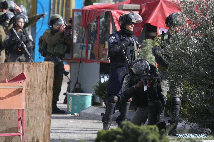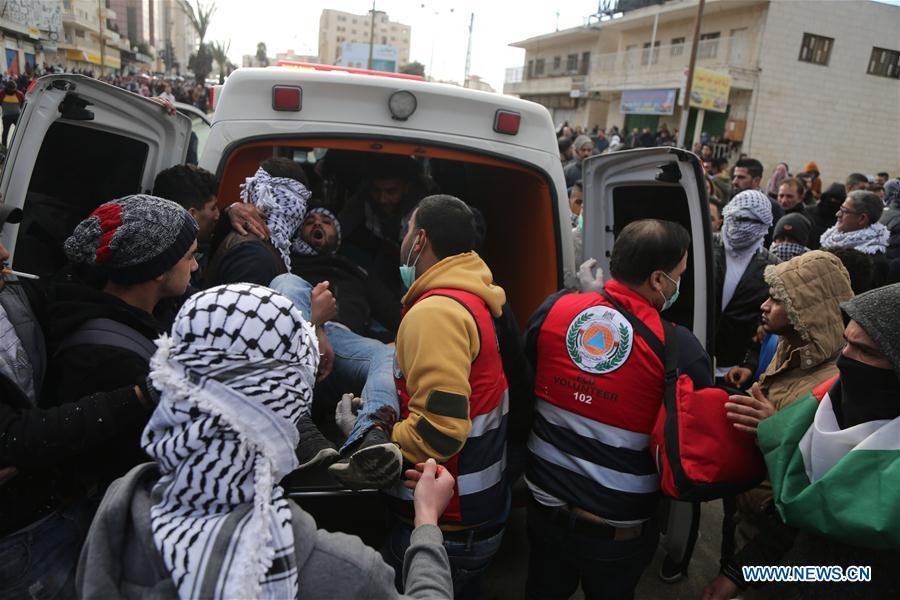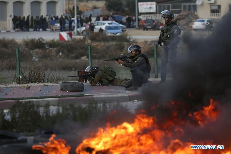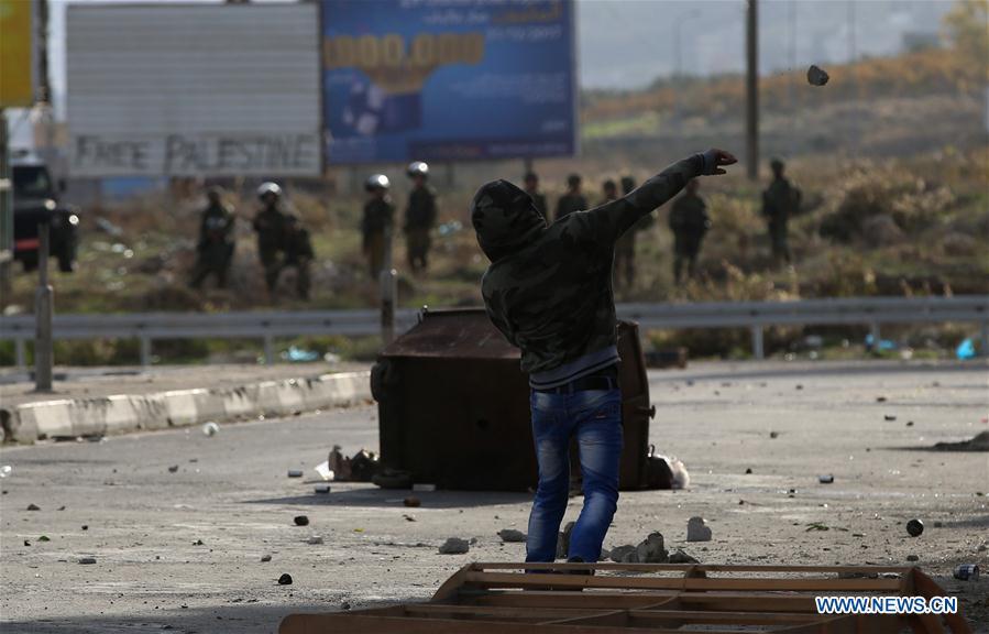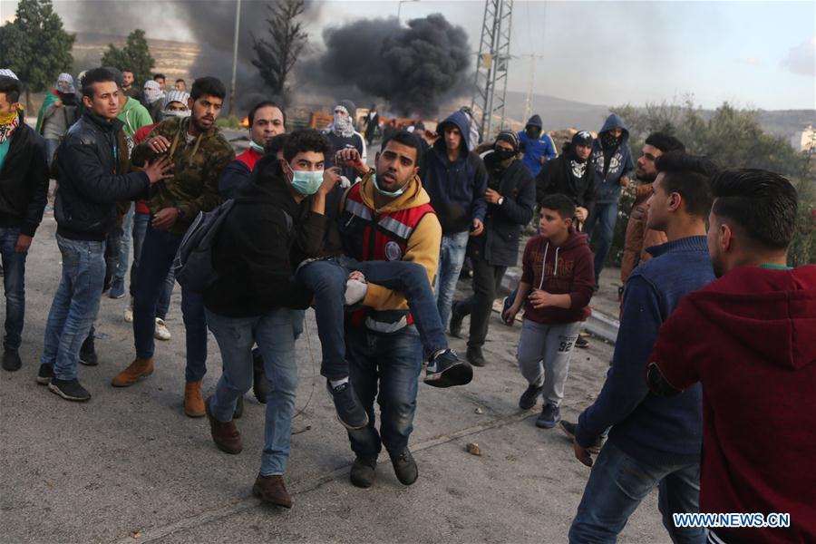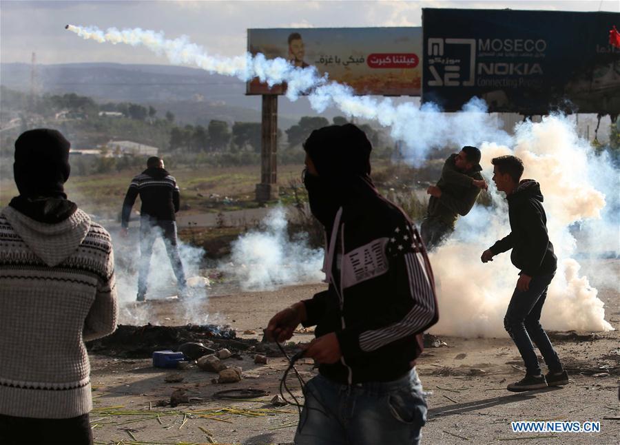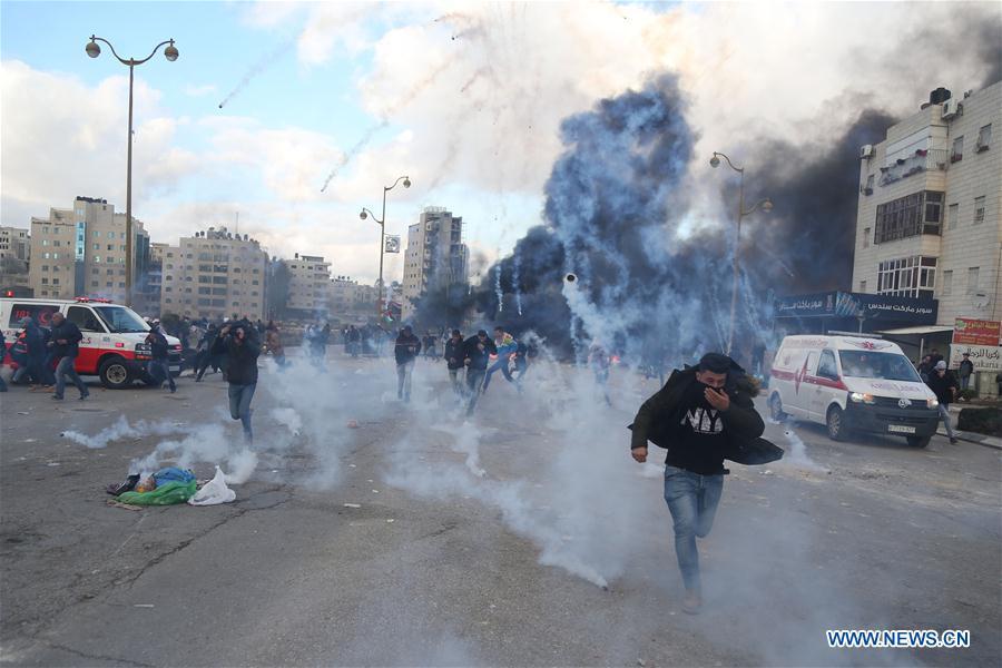 Palestinian protesters run to take cover from tear gas fired by Israeli soldiers during clashes after a protest against U.S. President Donald Trump's decision to recognize Jerusalem as the capital of Israel, in the West Bank city of Ramallah, Dec 7, 2017. (Xinhua/Stringer)