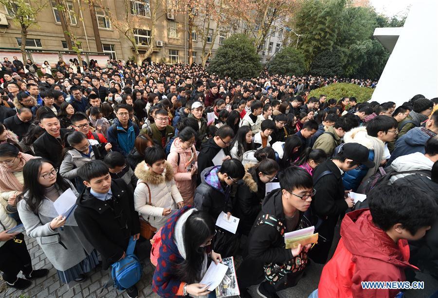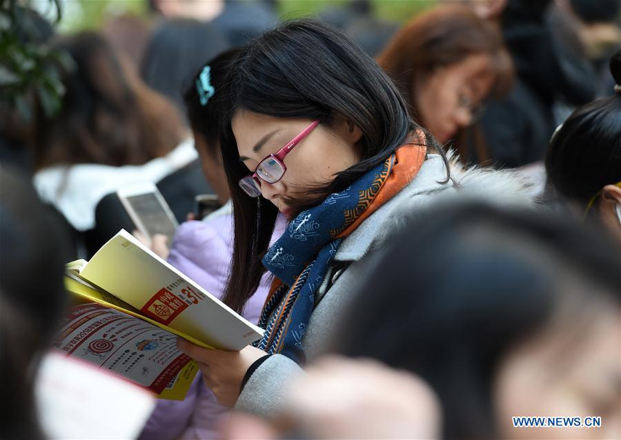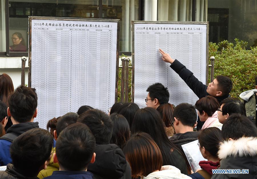 Examinees walk into Nanjing Forestry University to take the National Civil Servant Exam in Nanjing, east China's Jiangsu Province, Dec. 10, 2017. More than 1.1 million people took the National Public Servant Exam in China Sunday, a leap from last year's 984,000, marking the second time the number has hit the one million mark. (Xinhua/Sun Can)