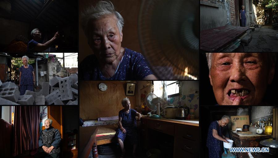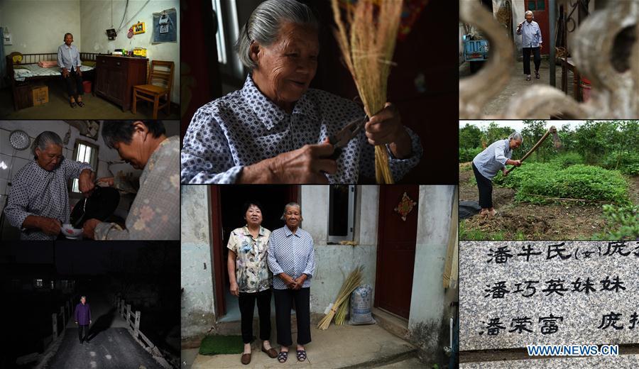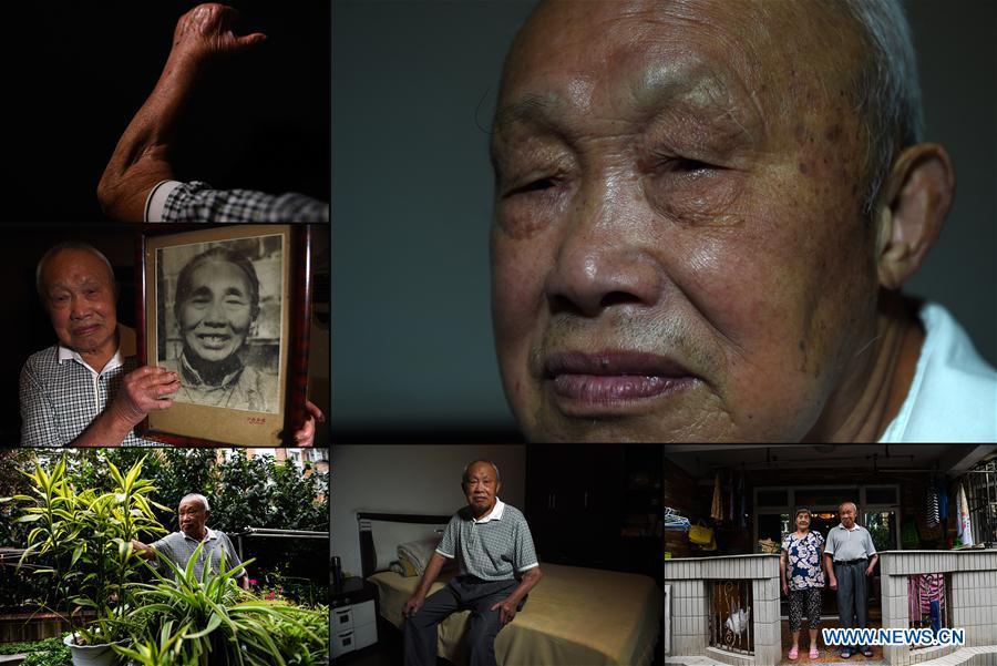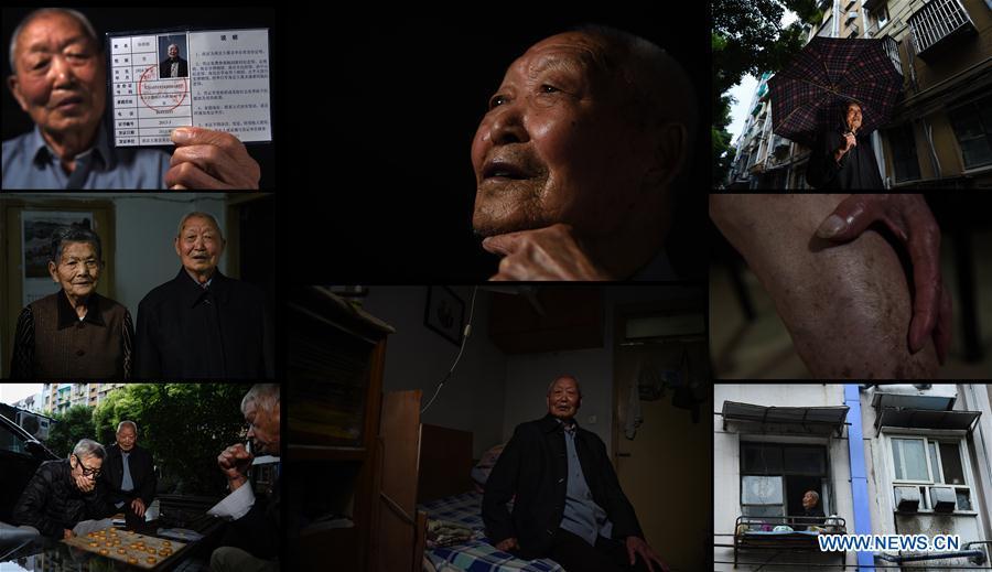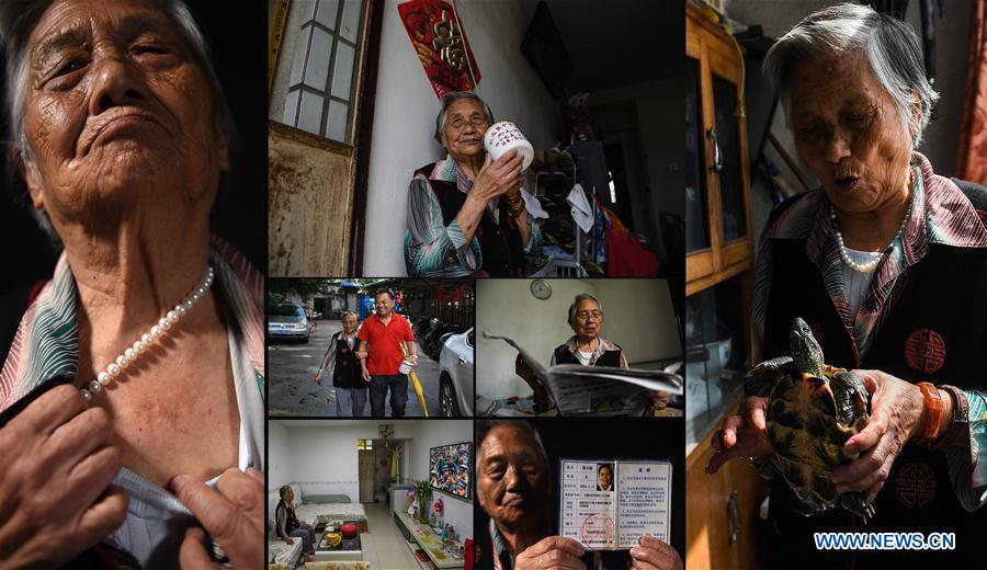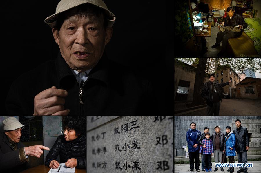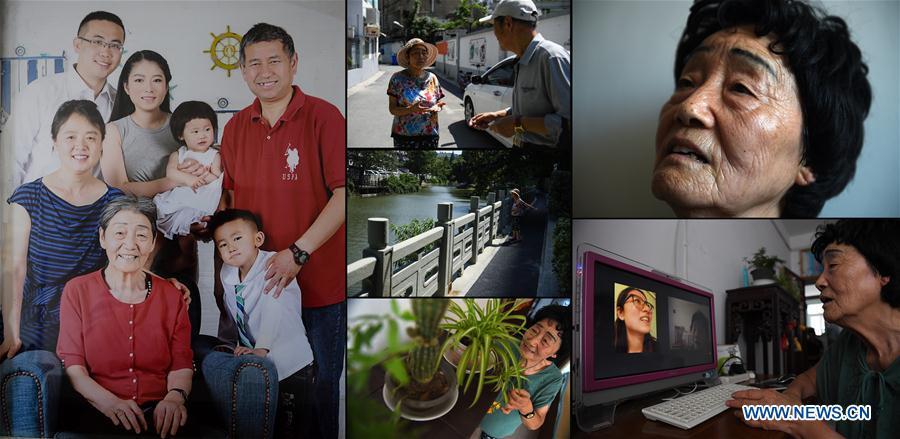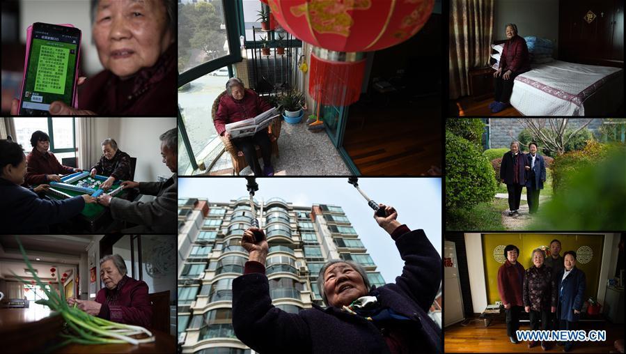 The combo photo taken on March 31, 2017 shows daily life of Jiang Shuzhen, a survivor of Nanjing Massacre. Photo (Up, C) shows Jiang reading newspaper at her balcony; Jiang showing her message on WeChat (L top); Jiang playing Majiang with her family members (L central); Jiang cooking vegetable at home (L bottom); Jiang staying at home (R top); Jiang taking a walk with her daughter-in-law (R central); Jiang, her daughter Huang Qinghua (1st L), her son Huang Qingguo (2nd R) and her daughter-in-law Wen Zhenxiu posing for a photo at home (R bottom). Jiang was born on Dec. 9, 1929. Before the Japanese invaders entered the city of Nanjing, her father went to southwest China's Chongqing. Her grandma together with her mother took Jiang and her two siblings to the countryside. Jiang once witnessed the Japanese invaders killing two Chinese young men. The year 2017 marks the 80th anniversary of the Nanjing Massacre, in which more than 300,000 Chinese were killed by the Japanese invaders who occupied Nanjing on Dec. 13, 1937, marking the start of six weeks of destruction, pillage, rape and slaughter in the city. There are only less than 100 living survivors of the atrocity. Reporters from Xinhua spent many years to look for the survivors of Nanjing Massacre and record their current lives. (Xinhua/Han Yuqing, Li Xiang and Ji Chunpeng)