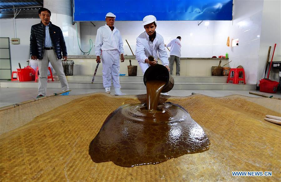 People collect sugarcanes for sugar factory in Hongkou Village of Xitan Township in Fu'an, southeast China's Fujian Province, Dec. 9, 2017. People here use the most ancient method to manually produce brown sugar. Sugar cane juice extracted from sugarcane is heated and constantly stirred in a pot until it becomes syrup. The heating process usually takes about four hours. (Xinhua/Wei Peiquan)