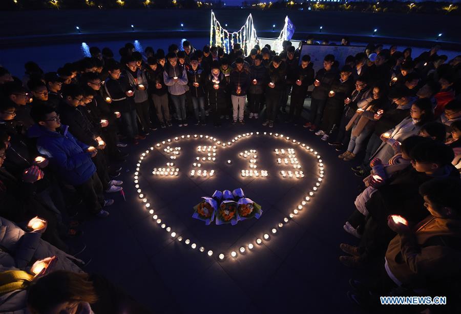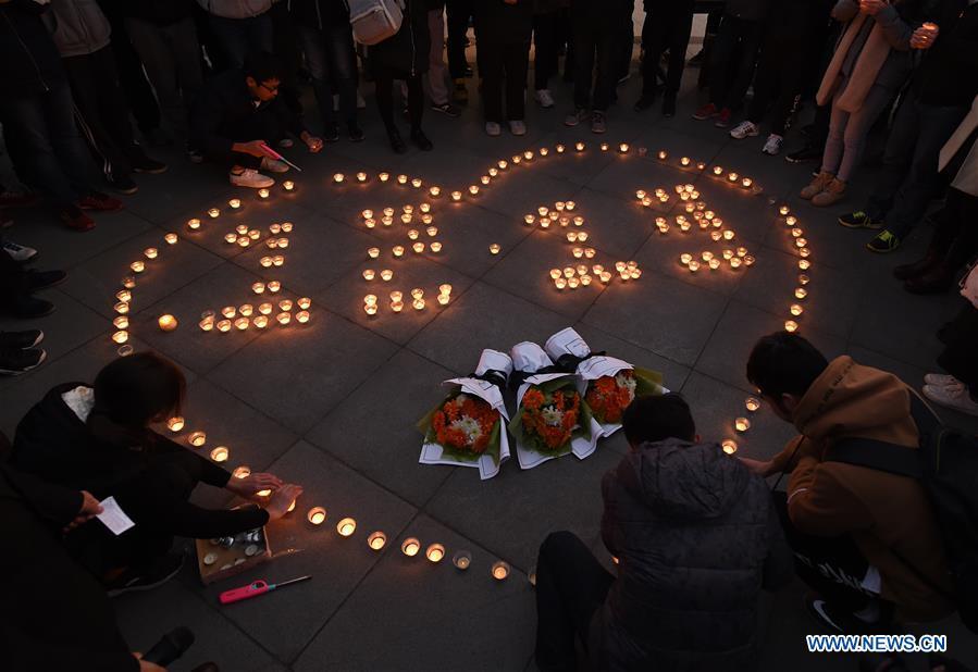 Students of Southeast University light candles in commemoration of victims of the Nanjing Massacre in Nanjing, capital of east China's Jiangsu Province, Dec. 12, 2017. Japanese troops captured Nanjing, then China's capital, on Dec. 13, 1937 and started a 40-odd-day slaughter. About 300,000 civilians and unarmed Chinese soldiers were brutally murdered. Over 20,000 women were raped. (Xinhua/Sun Can)