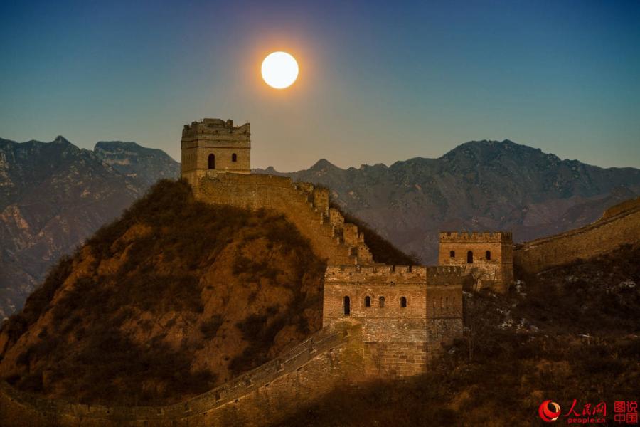 Located in a mountainous area in Luanping County, the Jinshanling section of the Great Wall glows under the winter starry sky. The magnificent ancient creation was built from 1570 CE during the Ming Dynasty and is 10.5 km long with 5 passes, 67 towers, and 3 beacon towers. (Photo/people.cn)