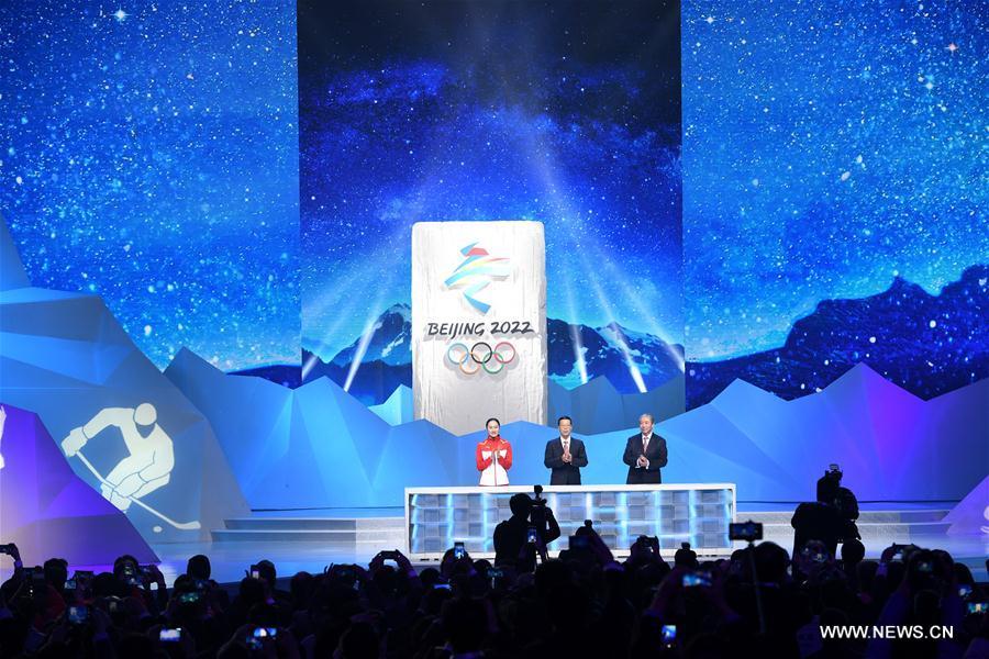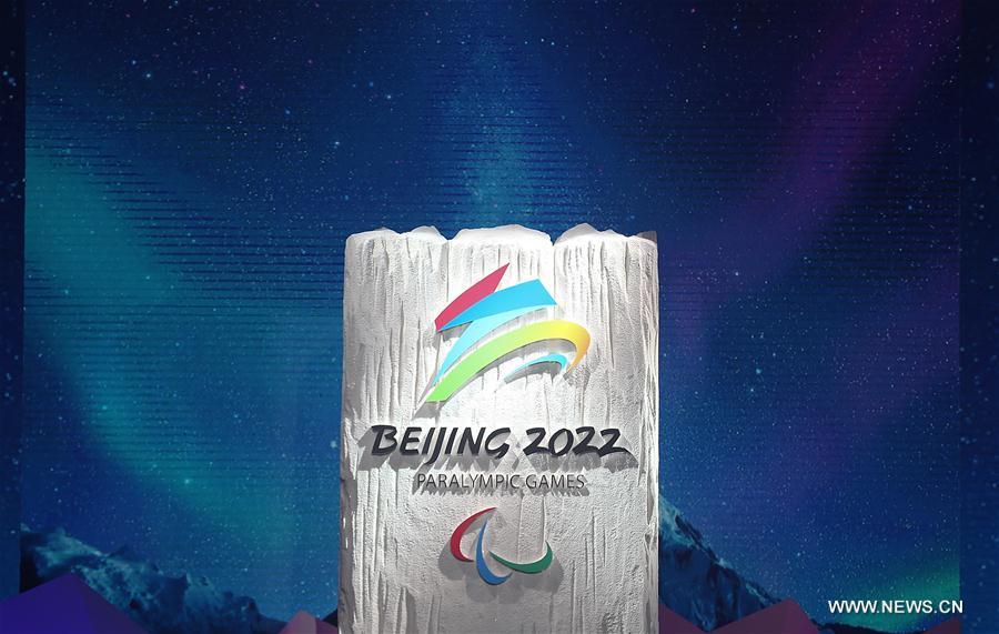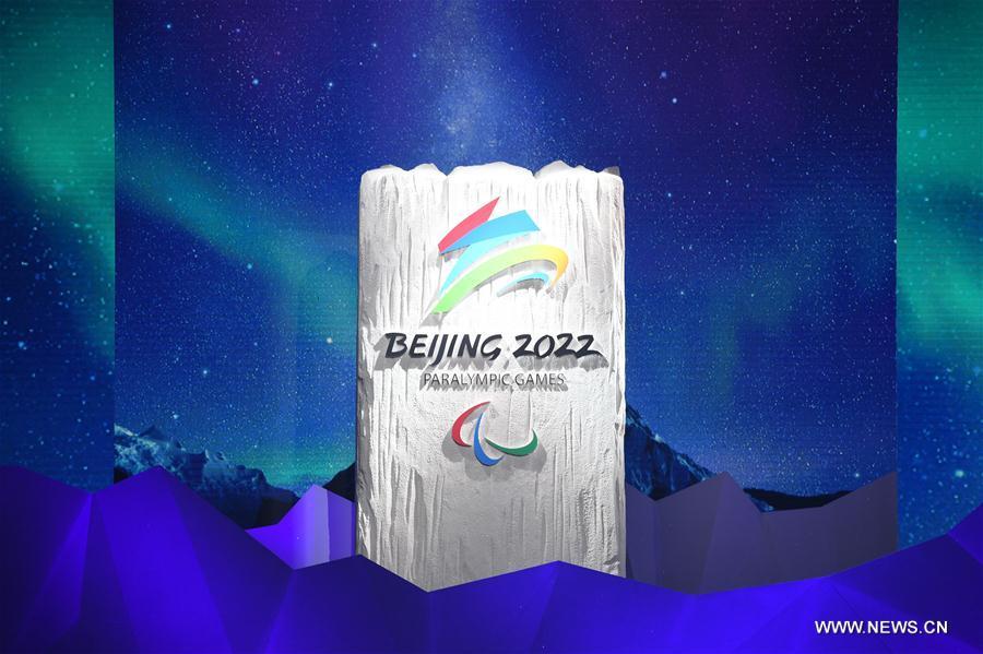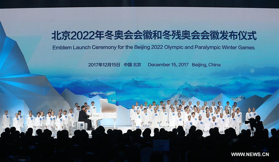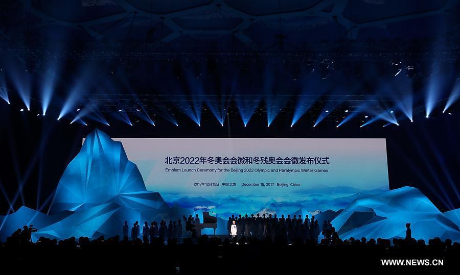 The emblem (L) of Beijing 2022 Olympic Winter Games and emblem of Beijing 2022 Paralympic Winter Games are seen during the emblem launch ceremony for the Beijing 2022 Olympic and Paralympic Winter Games in Beijing, capital of China, Dec. 15, 2017. (Xinhua/Ju Huanzong)