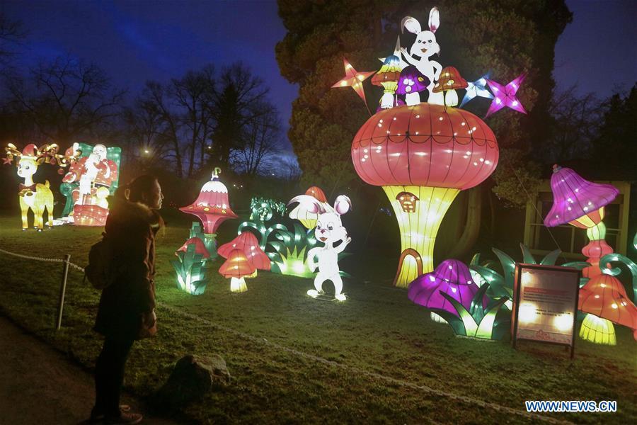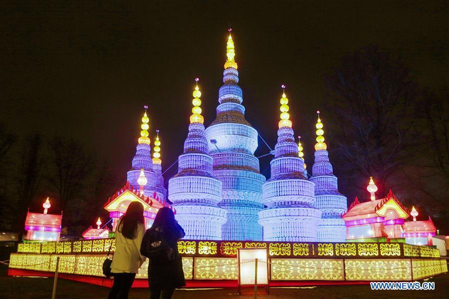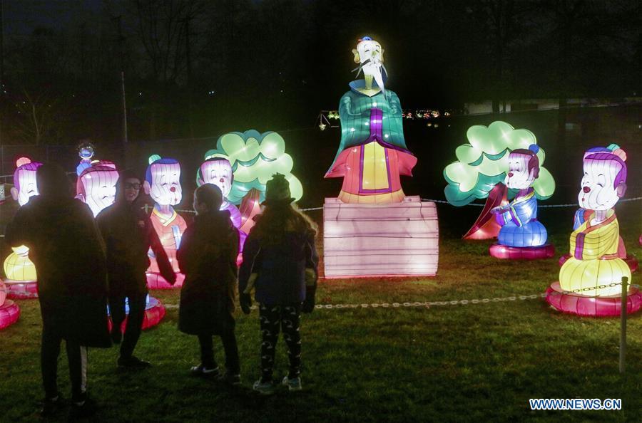 A resident looks at lanterns displayed during the opening night of the Vancouver Chinese Lantern Festival at the Pacific National Exhibition in Vancouver, Canada, Dec. 15, 2017. (Xinhua/Liang Sen)