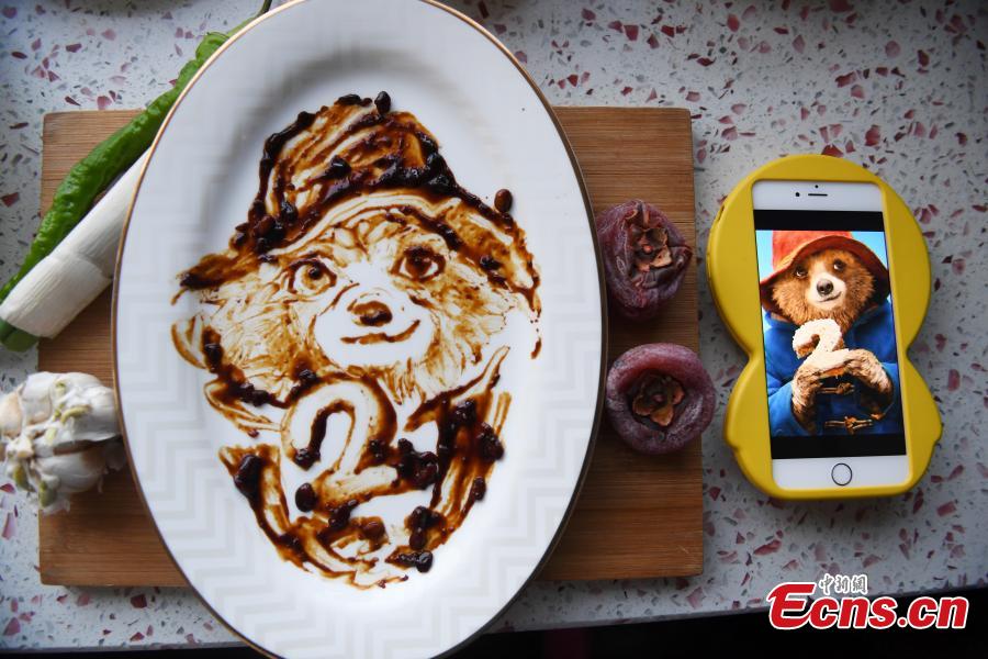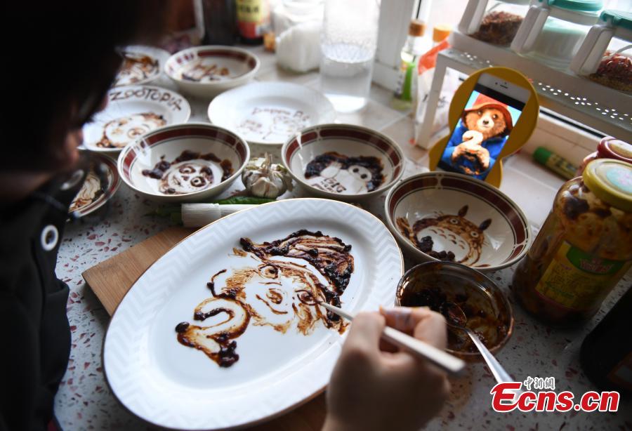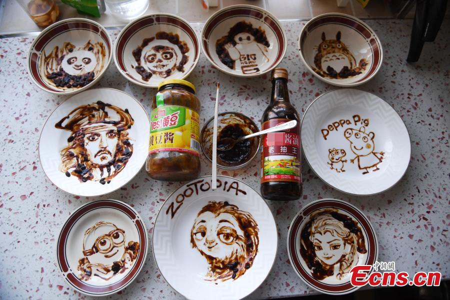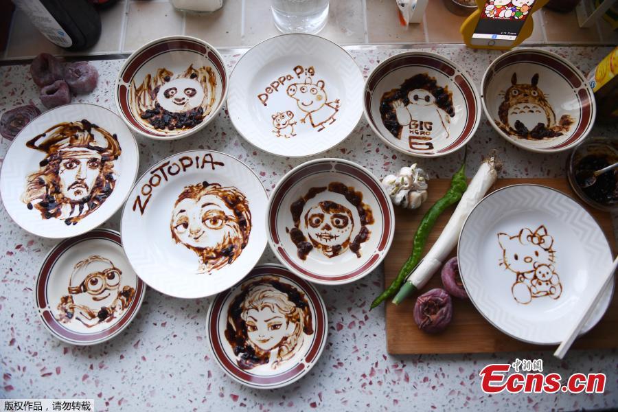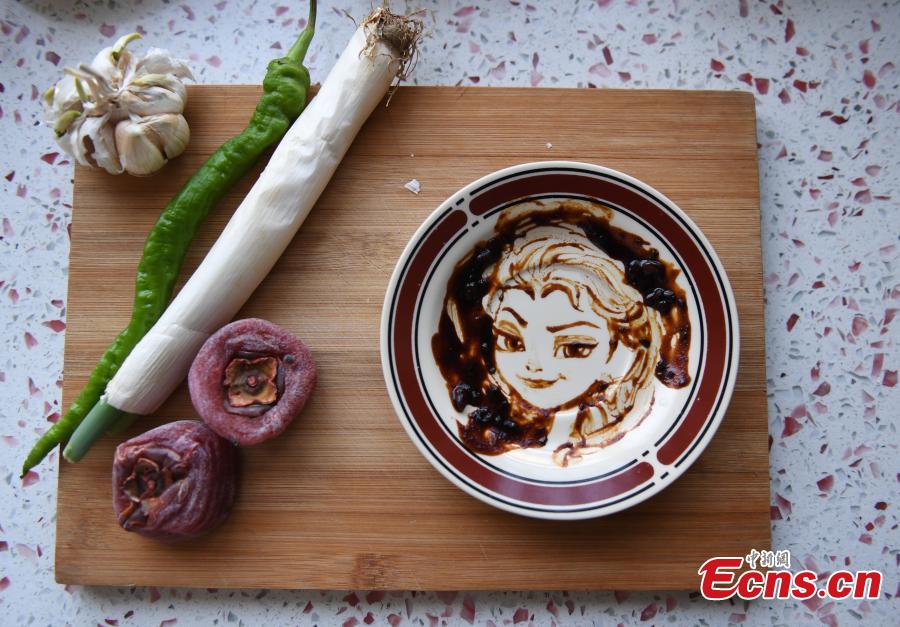 A mother from Changchun City in northeast China’s Jilin province creates a set of edible painting using plates as canvas, condiments as coloring and chopsticks as brushes. As mother of a three-year-old boy, Li Xiaohua created popular cartoon characters on empty plates with traditional soy bean paste and soy sauce to attract her son to food. Some of Li’s creations include the Minions, Kung Fu Panda, Peppa Pig and Disney Princess Elsa from Frozen. (Photo/China News Service/Zhang Yao)
