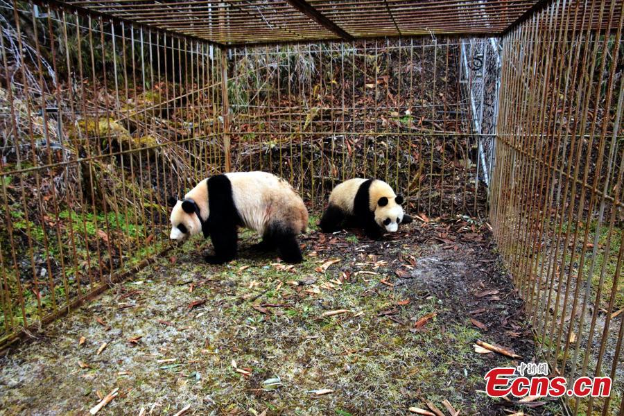 Panda Qinxin follows its mother Shuqin during a training before its reintroduction into the wild in Wolong, Southwest China's Sichuan province. Two panda cubs named Qinxin and Xiaohetao are trained for reintroduction into the wild by the China Conservation and Research Center for the Giant Panda in Wolong, Southwest China's Sichuan province. The cubs will be placed with their mothers in a wild area covering one square kilometers at a height of 2,450 meters to 3,100 meters above sea level. Their mothers will be responsible for the cubs-a break from the usual practice of keepers caring for cubs and feeding them milk. (Photo: China News Service/Li Chuanyou)