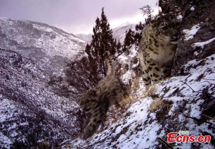 Images of snow leopards were caught for the first time in eastern parts of southwest China's Tibet Autonomous Region. A total of 20 infrared cameras installed at a 100 square kilometers area in the Nujiang River valley captured footage of the cats several times since November, according to local authorities Monday. (Photo provided to China News Servcie)
