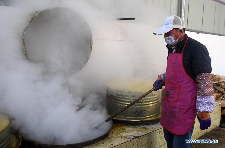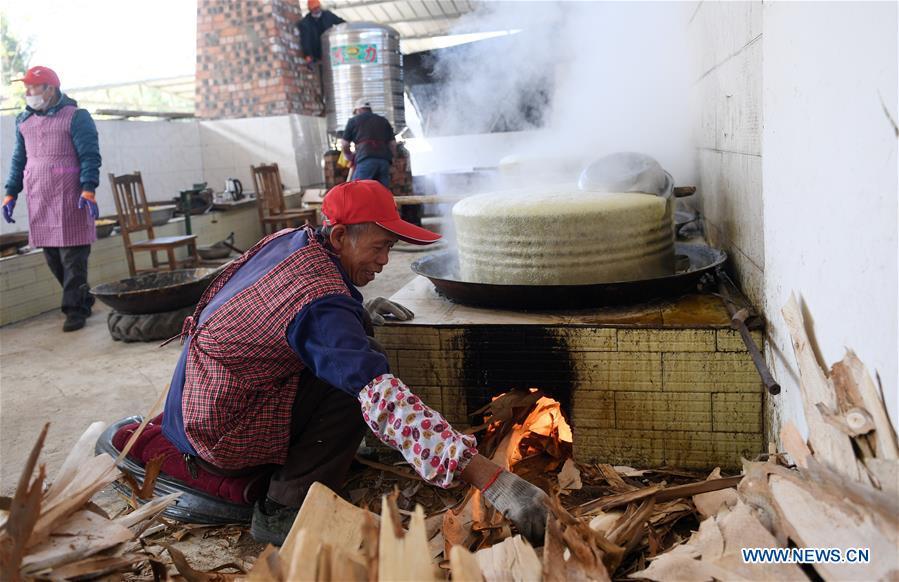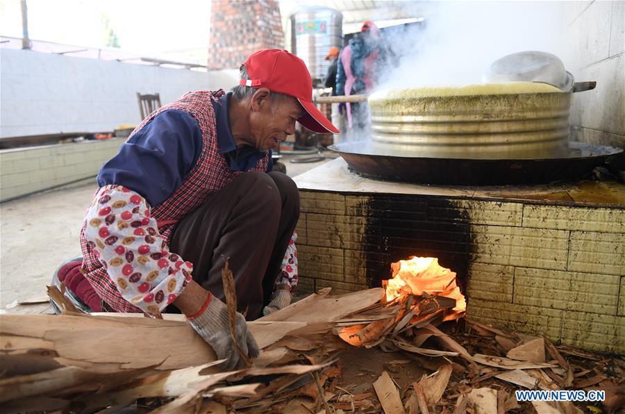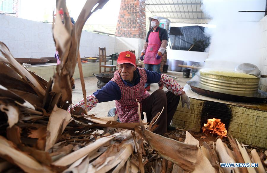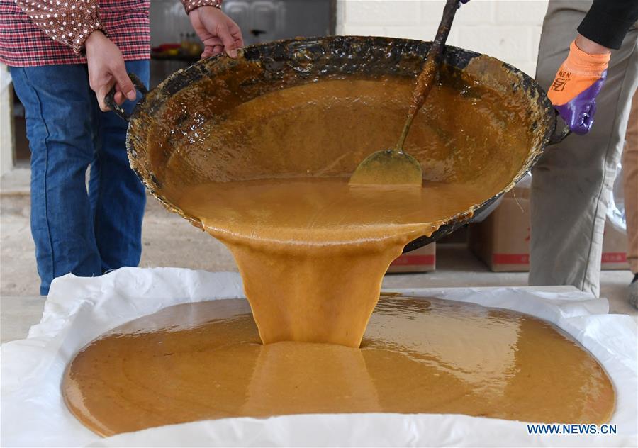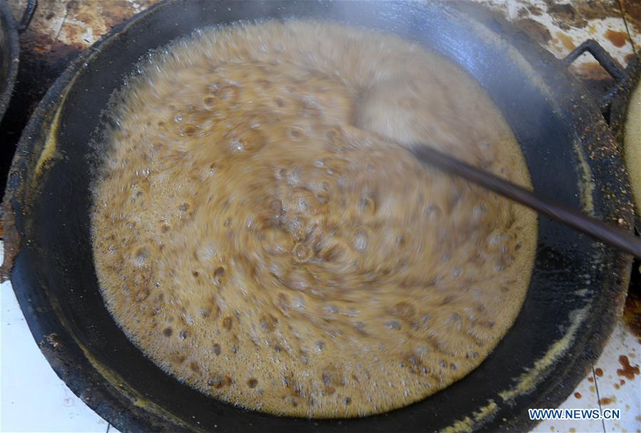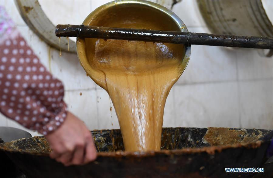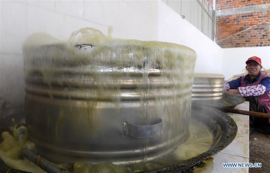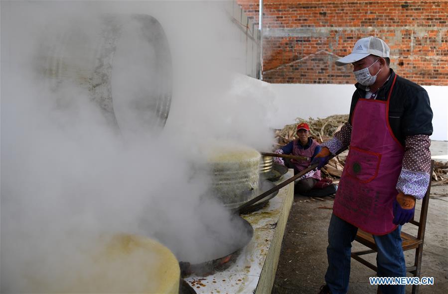 A villager stirs the sugar syrup to make brown sugar at Fuliang Village of Fucheng Township in Nanning, capital of south China's Guangxi Zhuang Autonomous Region, Dec. 19, 2017. The handmade Fucheng brown sugar, enlisted as an intangible cultural heritage in Nanning, has a history of more than a century. (Xinhua/Lu Bo'an)