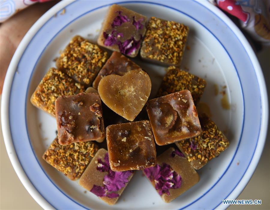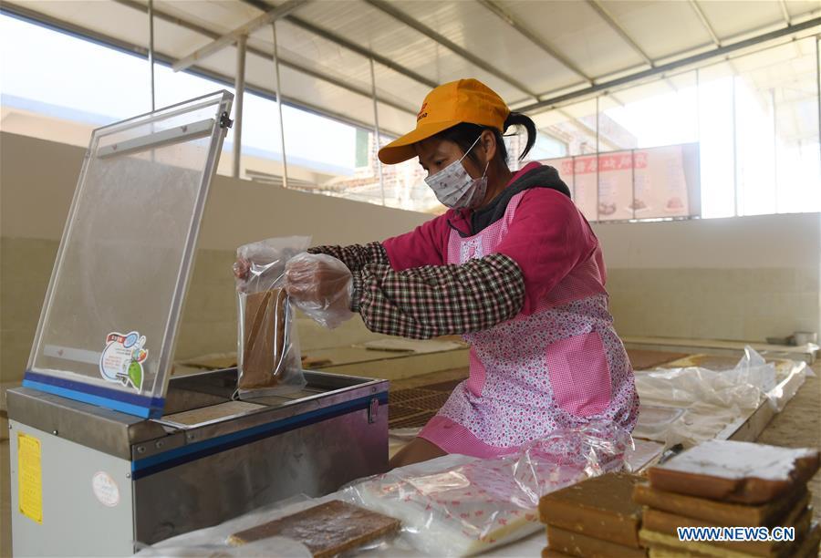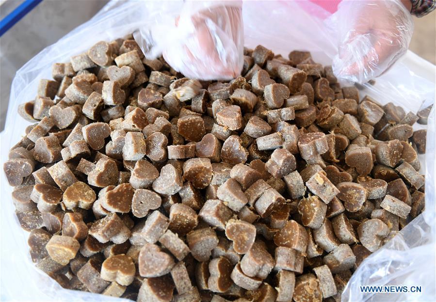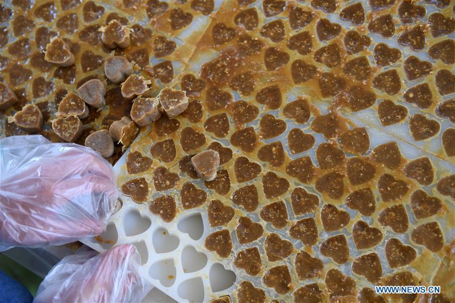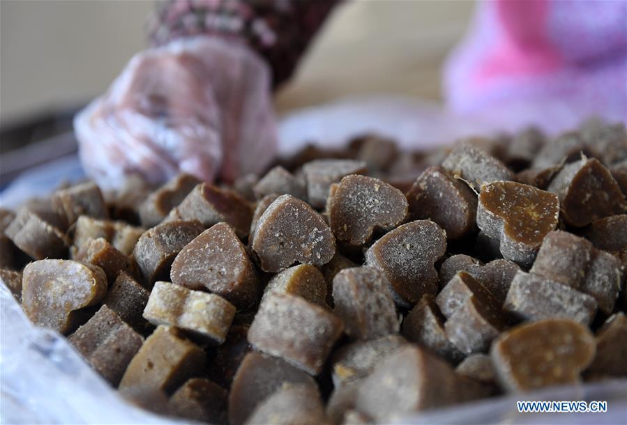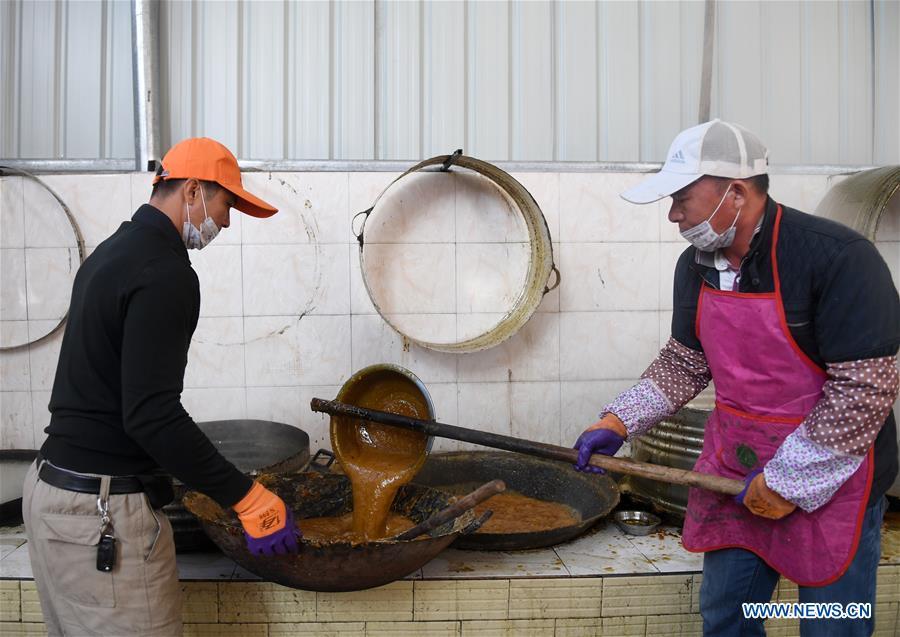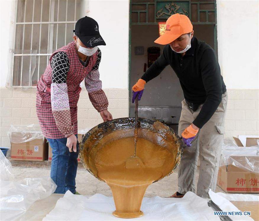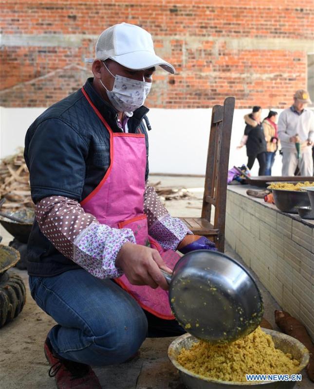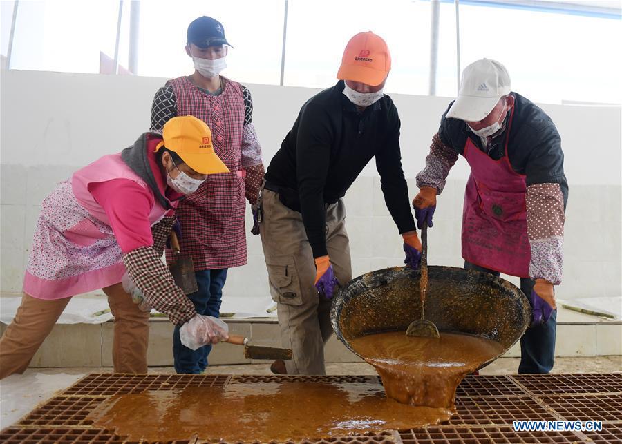 A villager stirs the sugar syrup to make brown sugar at Fuliang Village of Fucheng Township in Nanning, capital of south China's Guangxi Zhuang Autonomous Region, Dec. 19, 2017. The handmade Fucheng brown sugar, enlisted as an intangible cultural heritage in Nanning, has a history of more than a century. (Xinhua/Lu Bo'an)