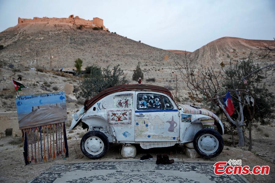 U.S. tourists Stafford Newsome and Kaitlin Taft, take their breakfast next to Jordanian Mohammed Al-Malahim, owner of a Volkswagen Beetle which he claims to be the "world's smallest hotel", in Shoubak, Jordan December 20, 2017. Picture taken December 20, 2017. (Photo/Agencies)