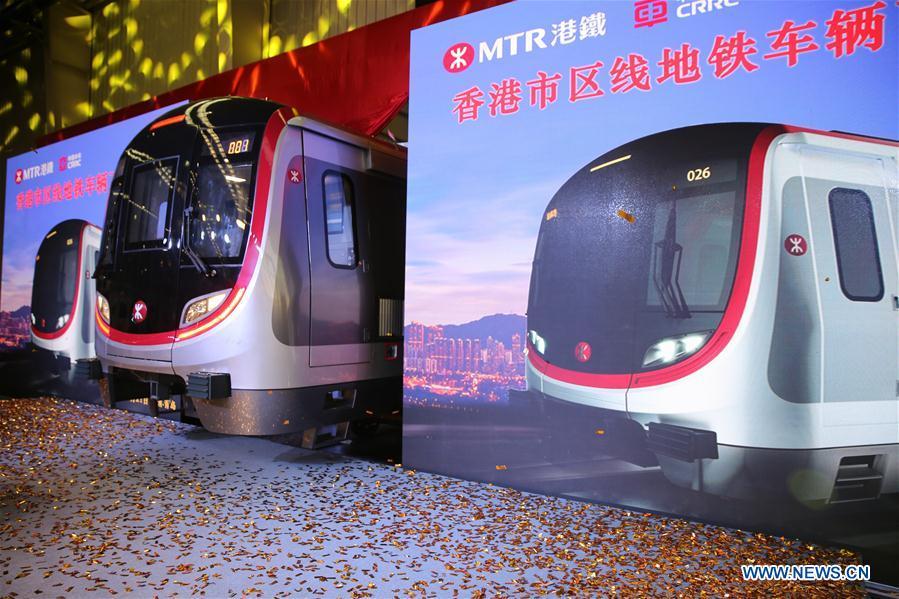Staff members of Hong Kong MTR corporation pose for a group photo in the cabin of a new subway train at CRRC Qingdao Sifang Company in Qingdao, east China's Shandong Province, Dec. 21, 2017. The subway train, possessing the highest international standard for fire safety, came off the assembly line in Qingdao on Thursday. The train was developed for downtown lines in Hong Kong, south China. (Xinhua/Zhang Jingang)