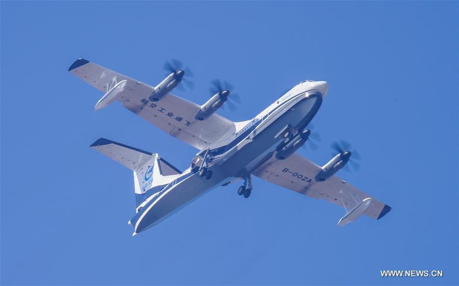 China's first home-grown large amphibious aircraft AG600 takes off at the Jinwan Civil Aviation Airport in Zhuhai, south China's Guangdong Province, Dec. 24, 2017. AG600, code named "Kunlong", completed its maiden flight on Sunday. (Xinhua/Liang Xu)