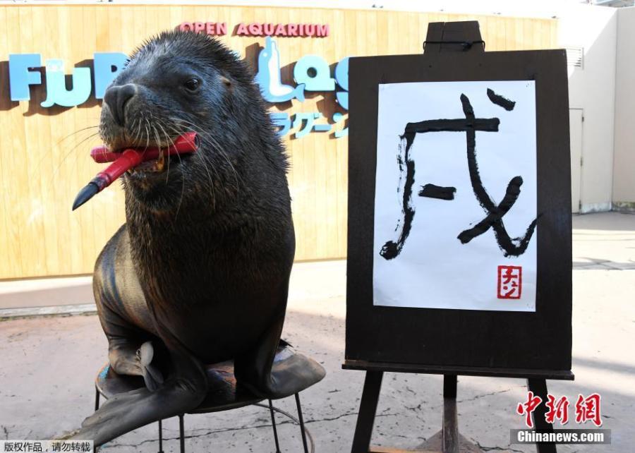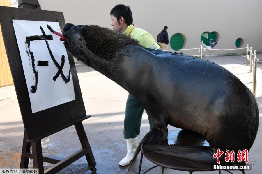 Chen, the 13-year-old sea lion at Yokohama Hakkeijima Sea Paradise in Yokohama, writes the Chinese character for "dog", which is next year's Chinese zodiac sign, during a press preview on December 26, 2017. Chen will perform twice a day from January 1, 2018 until Juanuary 31. (Photo/Agencies)
