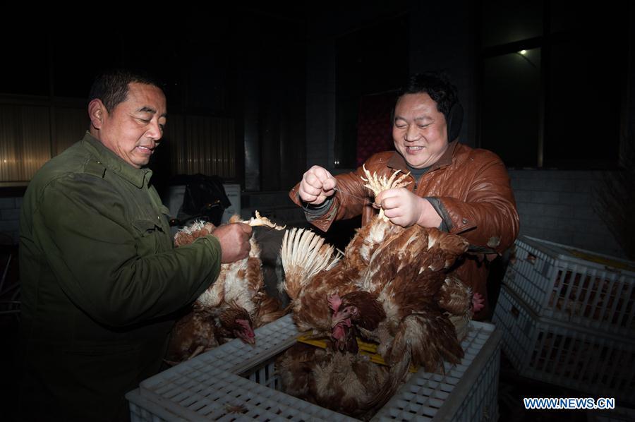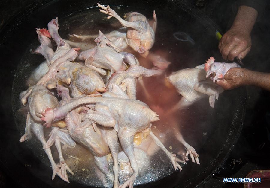 Zhao Zhongqiang, an inheritor of an intangible cultural heritage Guanqia stewed chicken, adds ingredients into a pot at Guanqia Village in Jinzhou City of Shijiazhuang, capital of north China's Hebei Province, Dec. 24, 2017. Guanqia stewed chicken, with a history of over 160 years, is famous for its choosing of raw materials and flavor. It was listed as a city-level intangible cultural heritage of Shijiazhuang in 2009. (Xinhua/Pu Dongfeng)