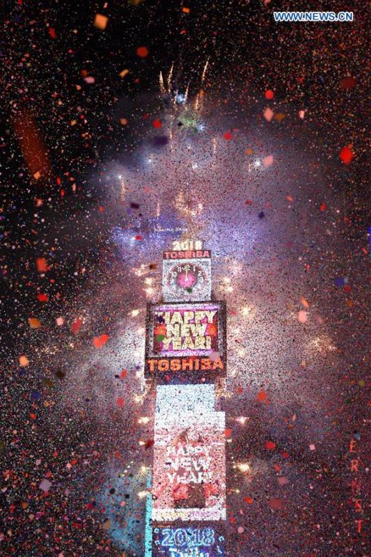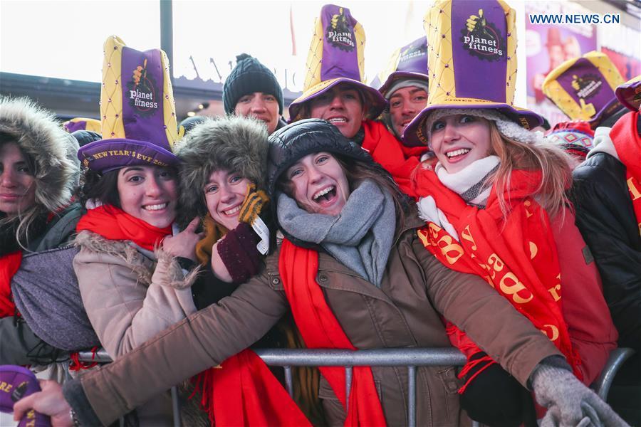 People attend the New Year celebration at Times Square in New York, the United States, on Dec. 31, 2017. (Xinhua/Wang Ying)