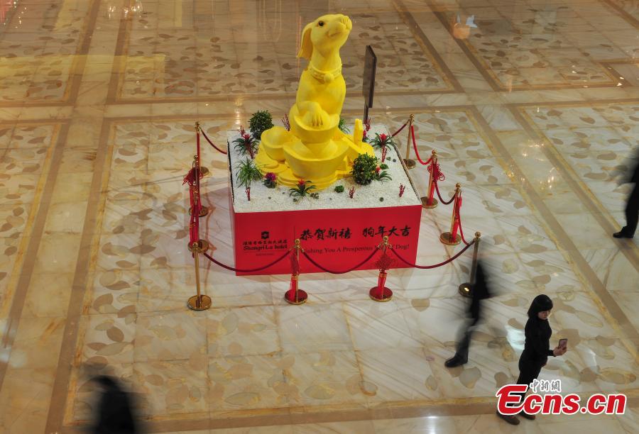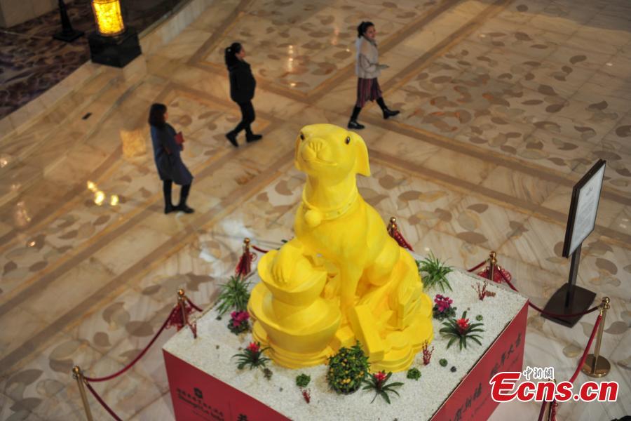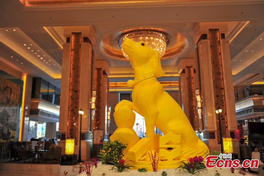 A dog-shaped butter statue on display at a hotel in Shenyang City, the capital of Northeast China’s Liaoning Province, Jan. 1, 2018. It took 20 days and 150 kilograms of butter to create the 3.6-meter-tall, 1.3-meter-wide statue. In Chinese astrology, each year is related to a zodiac animal following a 12-year cycle. 2018 will be the Year of Dog. (Photo: China News Service/Yu Haiyang)