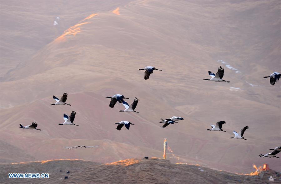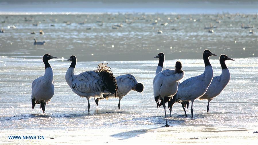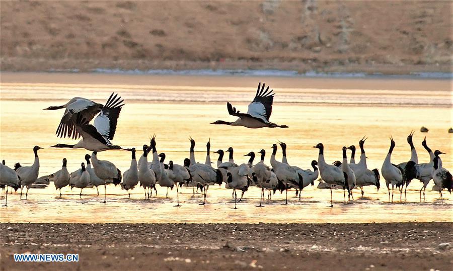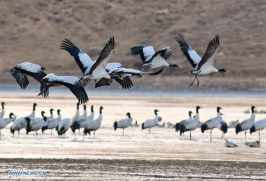Black-necked cranes are seen in Linzhou County of Lhasa City, capital of southwest China's Tibet Autonomous Region, Jan. 1, 2018. Tibet has become the world's largest winter habitat for critically endangered black-necked cranes. It is currently temporary home to over 8,000 black-necked cranes, around 80 percent of the world's total population. (Xinhua/Zhang Rufeng)