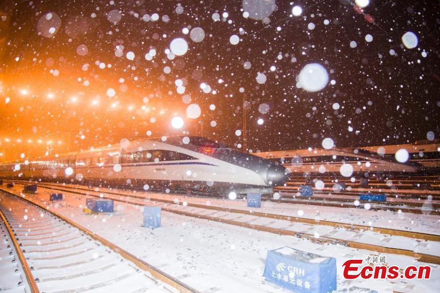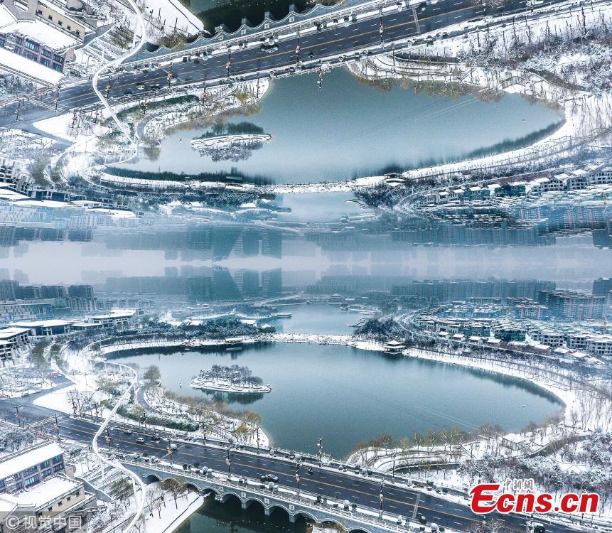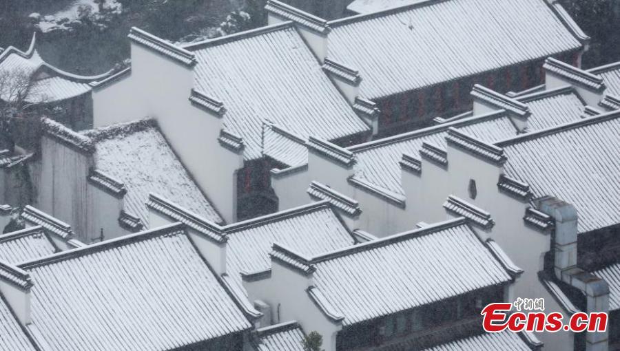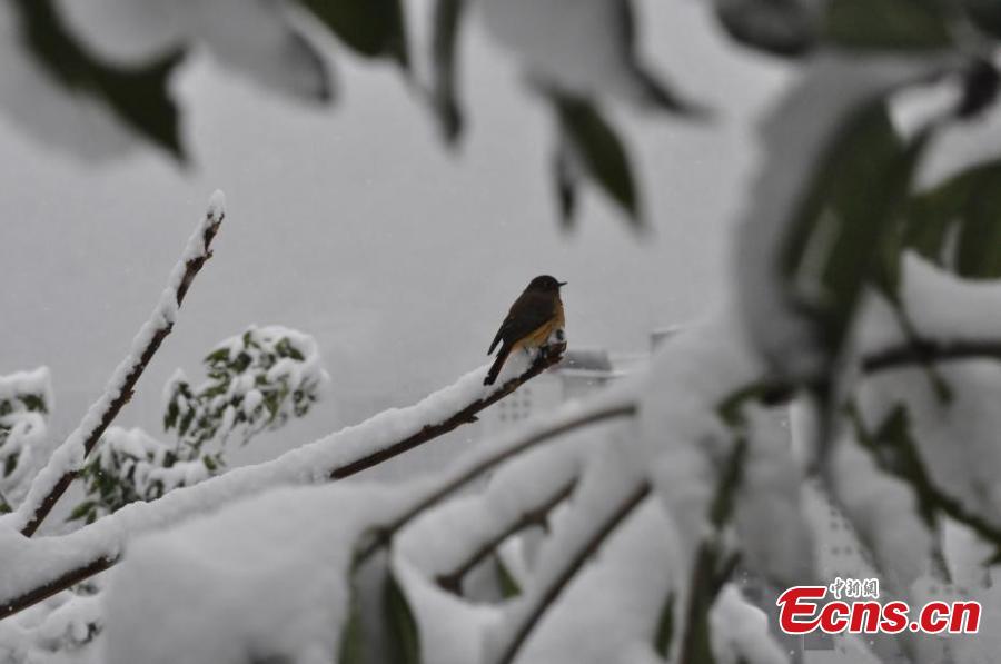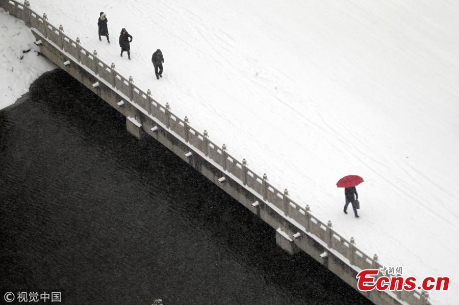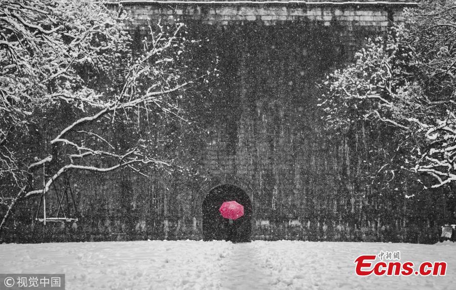 Wintersweet flowers in snow look beautiful against a red wall at Ming Xiaoling Mausoleum in Nanjing City, the capital of East China’s Jiangsu Province, Jan. 4, 2018. (Photo/VCG)