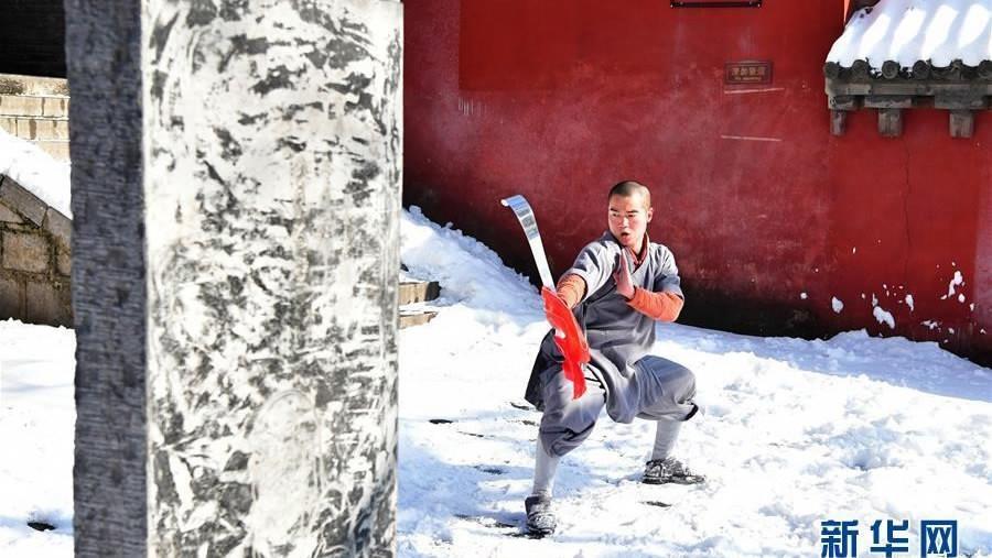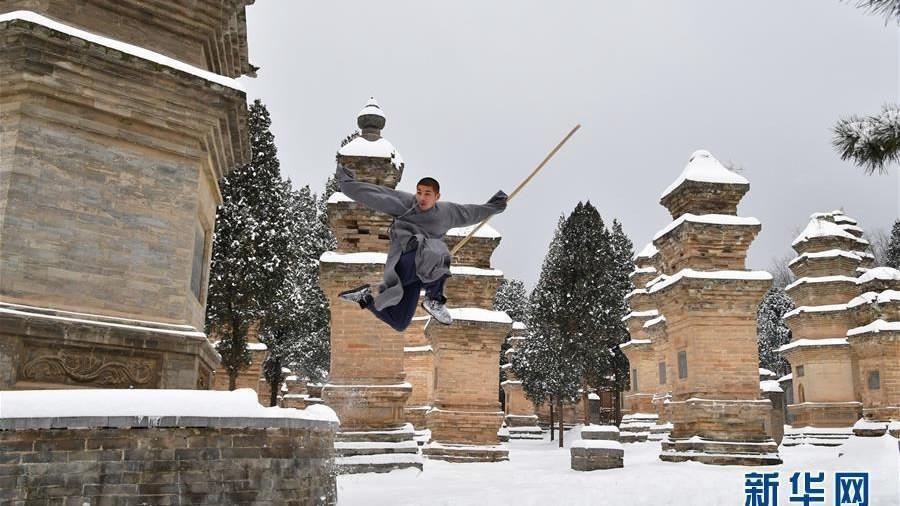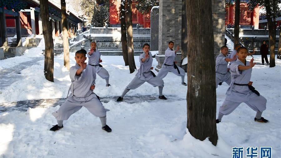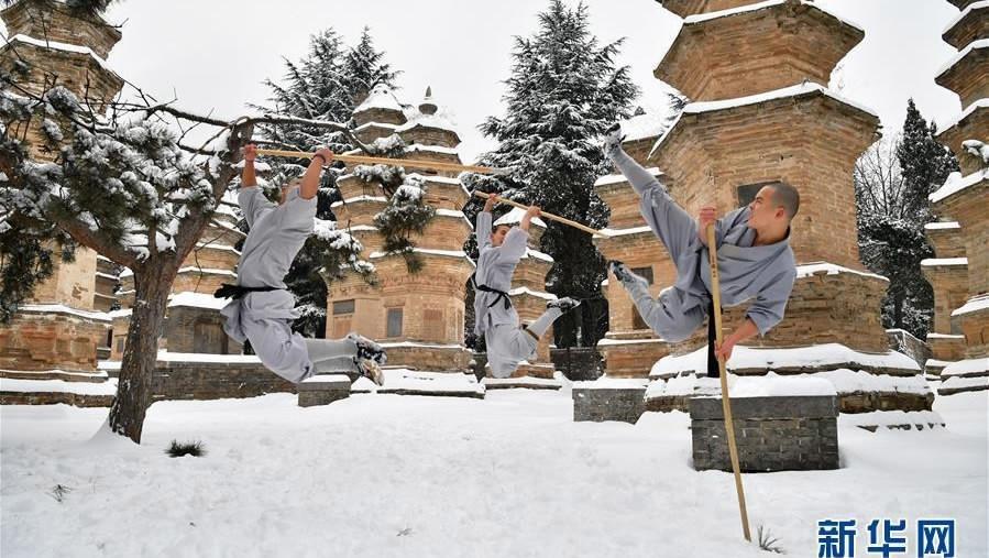 A group of monks is seen at the Shaolin Temple on Songshan Mountain, central China's Henan Province braving the chill and practising Chinese Kung Fu after heavy snow hit the region. (Photo/Xinhua)