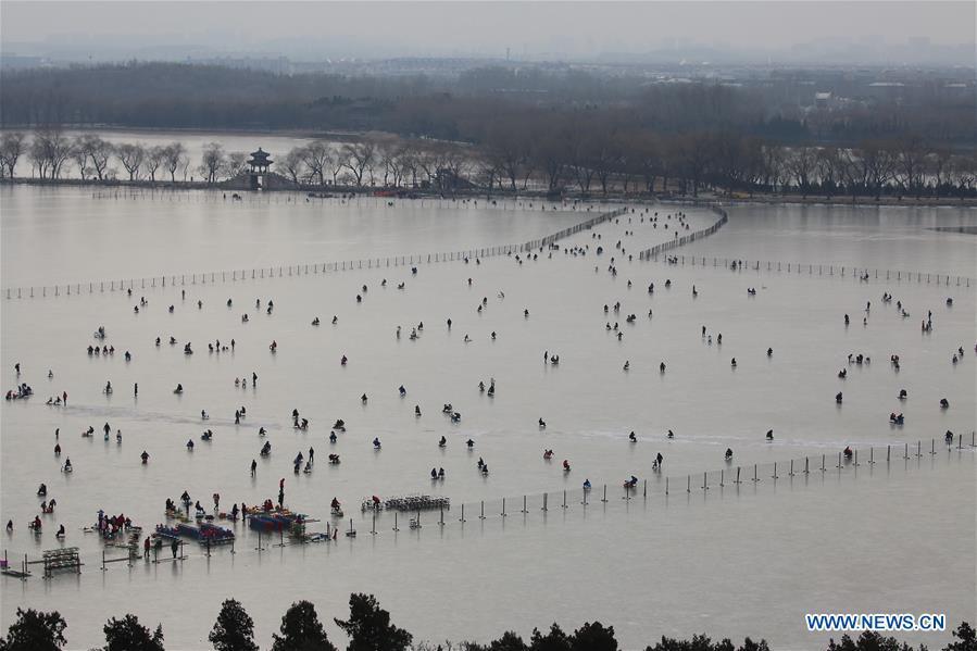 A tourist rides an ice bike in the ice rink at the Summer Palace in Beijing, capital of China, Jan. 7, 2018. During the weekend, many people came to the ice rink on Kunming Lake to relax or take exercise.(Xinhua/Liu Xianguo)