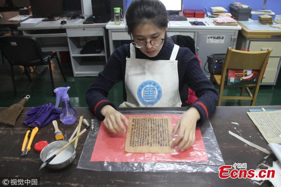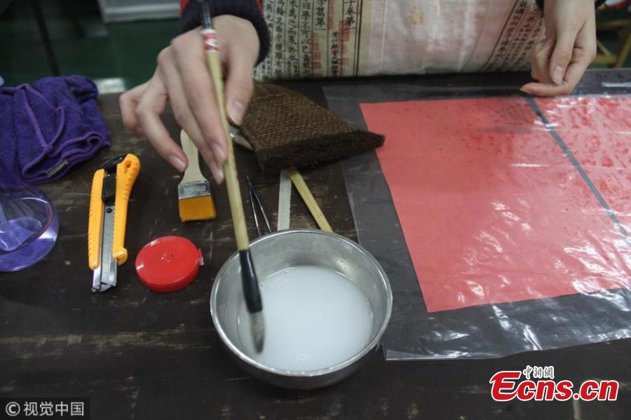 Xia Tianni repairs a damaged old book in Jinan City, the capital of East China’s Shandong Province, Jan. 6, 2018. Xia, 24, graduated from the major of antique appraisals and restoration of cultural relic at Shandong University of Art and Design. Among the 36 students in her class, only two now engage in restoring relics after graduation. (Photo/VCG)