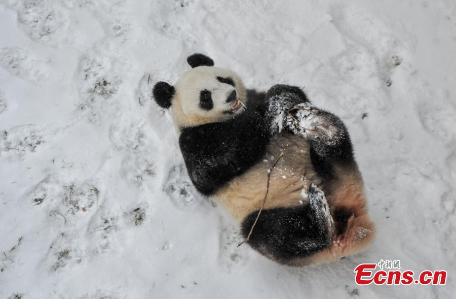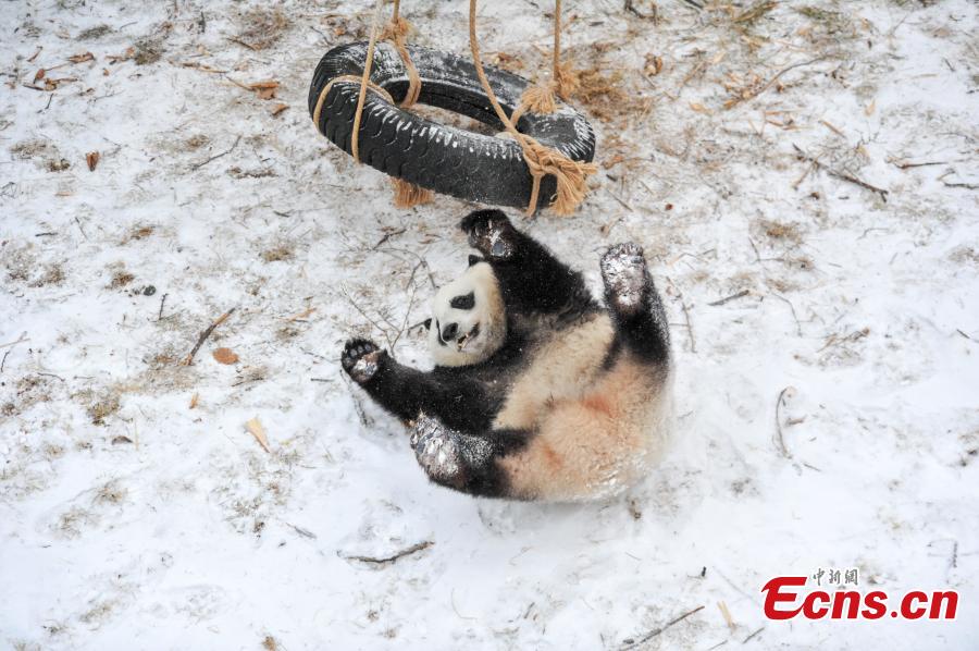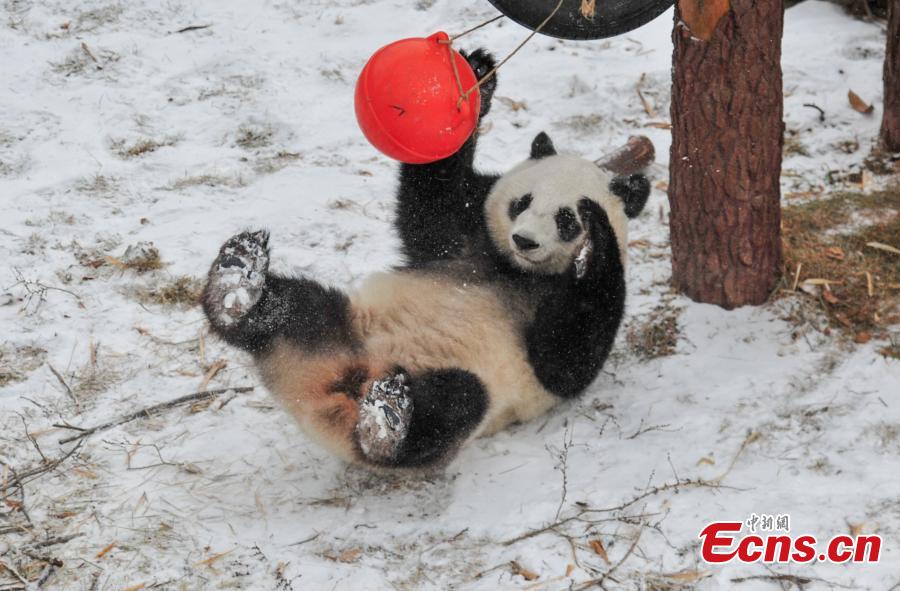A giant panda plays in the snow at Shenyang Forest Zoological Garden in Shenyang City, the capital of Northeast China’s Liaoning Province, Jan. 8, 2018. Shenyang had its first snowfall of the year on Monday. (Photo: China News Service/Yu Haiyang)