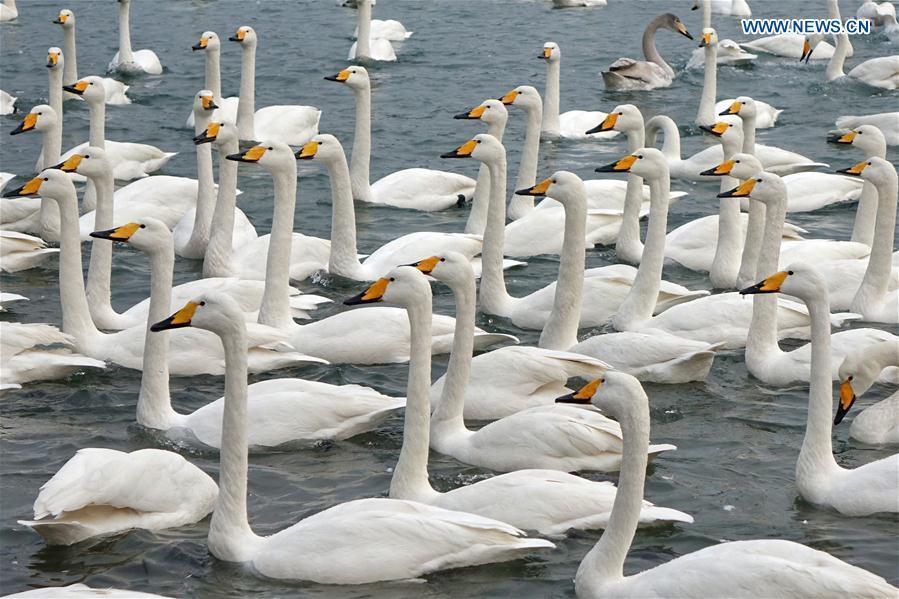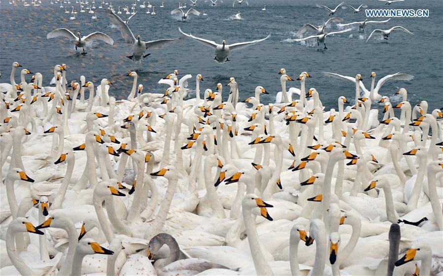 A tourist takes photos of swans at the sea area in Rongcheng City, east China's Shandong Province, Jan. 8, 2018. (Xinhua/Tang Ke)