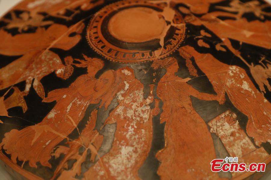 Two treasures from the Acropolis Museum in Athens are on display in Shanghai Museum, Shanghai, Jan. 10, 2018. The statue of the Kore, a dedication to the sanctuary of Athena on the Acropolis, depicts a young girl with a tender smile and beautiful clothes, showing the elegance of the women in ancient Athens. The Lekanis lid depicts the god Dionysus in intoxicated celebration accompanied by Eros cupids, a satyr and maenads, according to the museum. At the same time, the Acropolis Museum is holding an exhibition of two treasures from the Shanghai Museum – bronzeware from the early Spring and Autumn period and a painting from the Qing Dynasty (1368-1644). (Photo: China News Service/Zhang Hengwei)