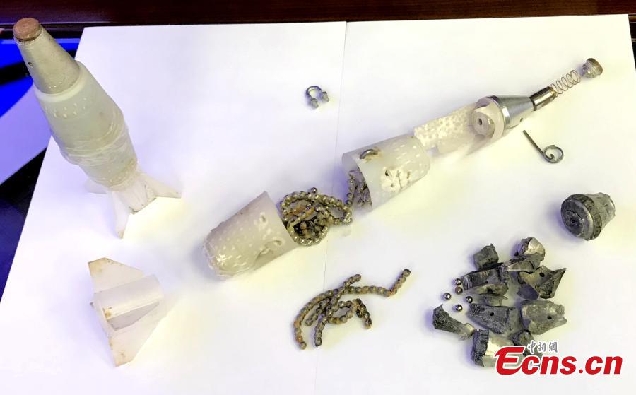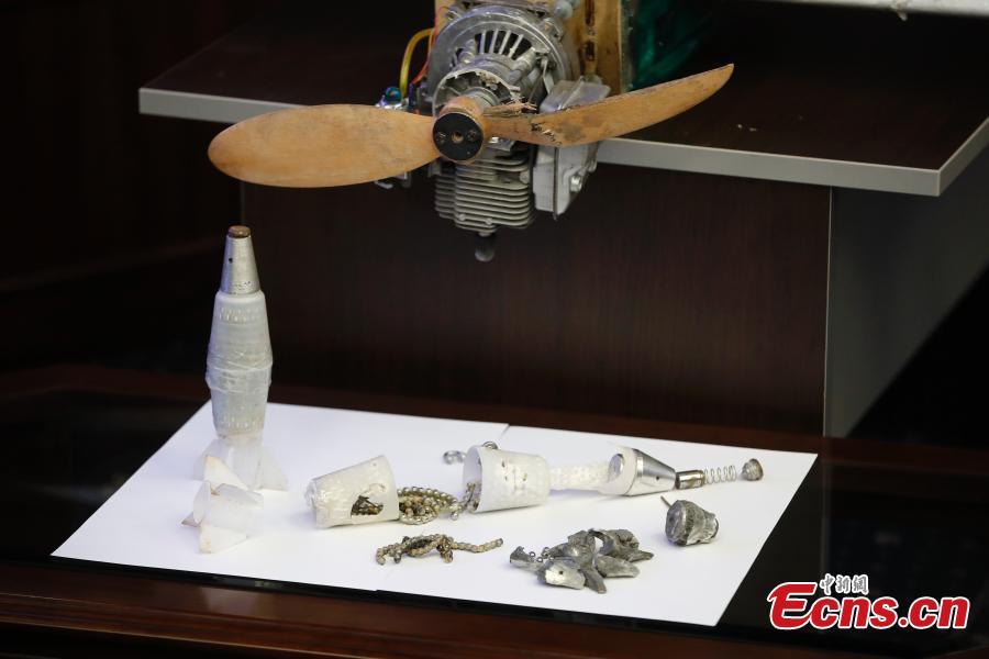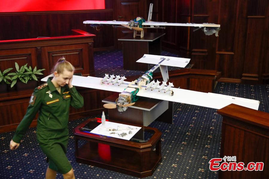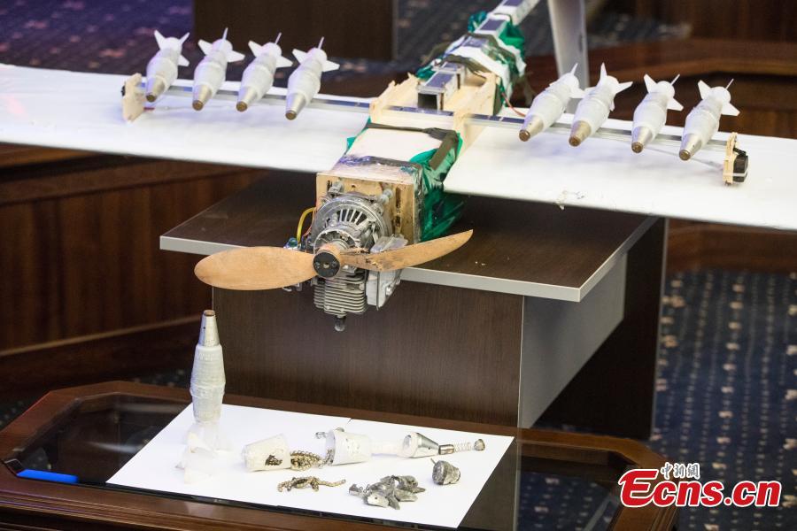 Drones used in attacks on Russian military bases in Syria are on display in Moscow, Russia, Jan. 11, 2018. Ten drones equipped with explosives attacked Russia's airbase in Hmeimim in the early hours of January 6, while three others targeted its naval base in the port of Tartus, according to the military. Russian General Alexander Novikov said both the drones carried 10 explosive devices, each weighing 400 grams, that were filled with what he called "small metal balls". The ministry said it was concerned about the threat of drones used "for terrorist purposes" following recent attacks. (Photo: China News Service/Wang Xiujun)