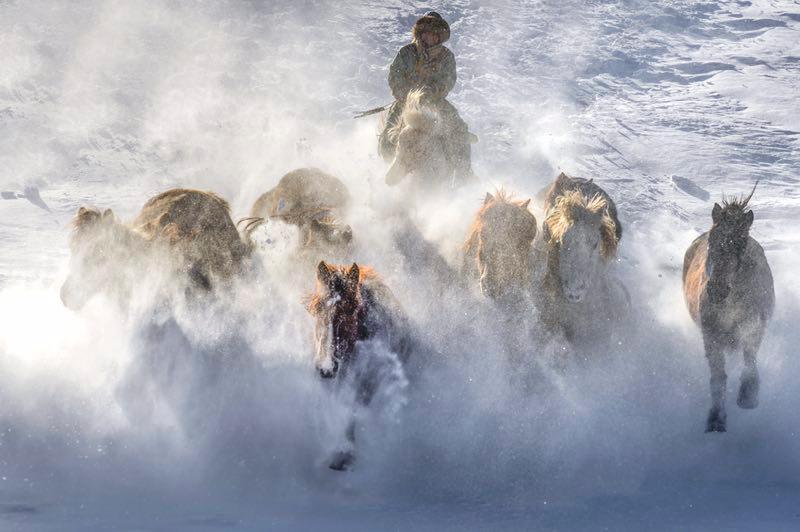 Horses with woman riders are at full gallop on the snow-covered Xilin Gol Grassland in North China’s Inner Mongolia autonomous region, showing their vigor and vitality in the winter. (Photo by Peng Guang and Jia Bin/Provided to chinadaily.com.cn)