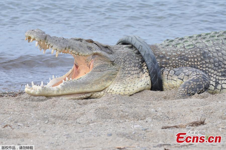 A saltwater crocodile with a motorbike tyre wrapped around its neck is seen in a river in Palu, Indonesia, Jan. 16, 2018. Indonesian conservation officials are racing to locate and rescue the crocodile, measuring around four meters long, stricken by the tyre for more than a year. (Photo/Agencies)