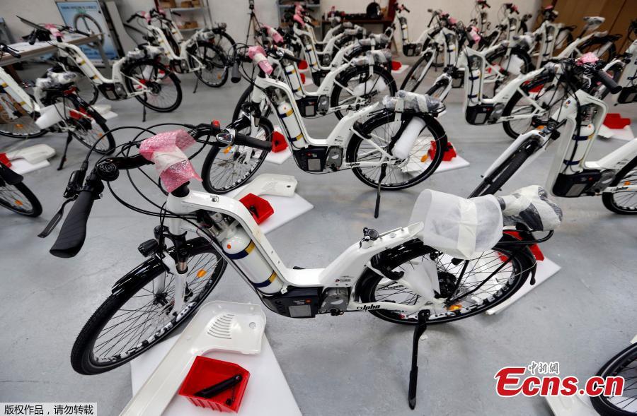 Alpha bikes, first industrialized bicycle to use a hydrogen fuel cell, are displayed at the Pragma Industries factory in Biarritz, France, Jan. 15, 2018. The French start-up has become the first company to start factory production of hydrogen-powered bicycles for use in corporate or municipal fleets. At about 7,500 euros per bike, and at least 30,000 euros for a charging station, the bikes are too expensive for the consumer market, but Pragma is working to cut that to 5,000 euros, which would bring their price in line with premium electric bikes. (Photo/Agencies)
