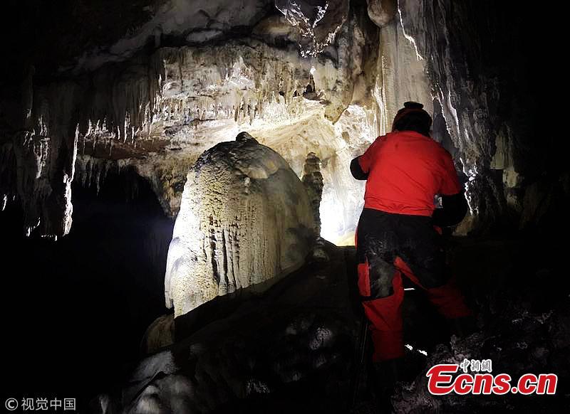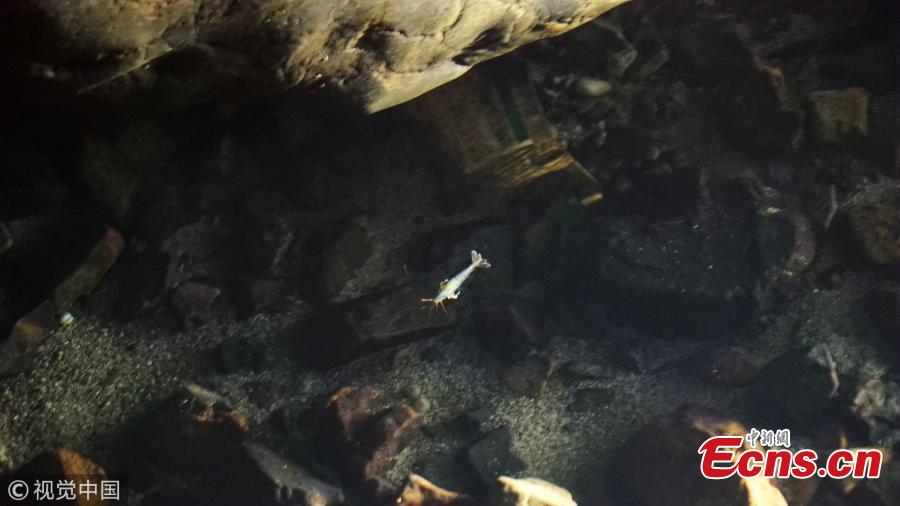 A French explorer makes notes at an underground cave in Jinchijiang District of Hechi City, South China’s Guangxi Zhuang Autonomous Region. Since Jan, 12, cave explorers from China and France have found species of rare blind cave fish and cave shrimps, which have strict requirements for water quality. (Photo/VCG)