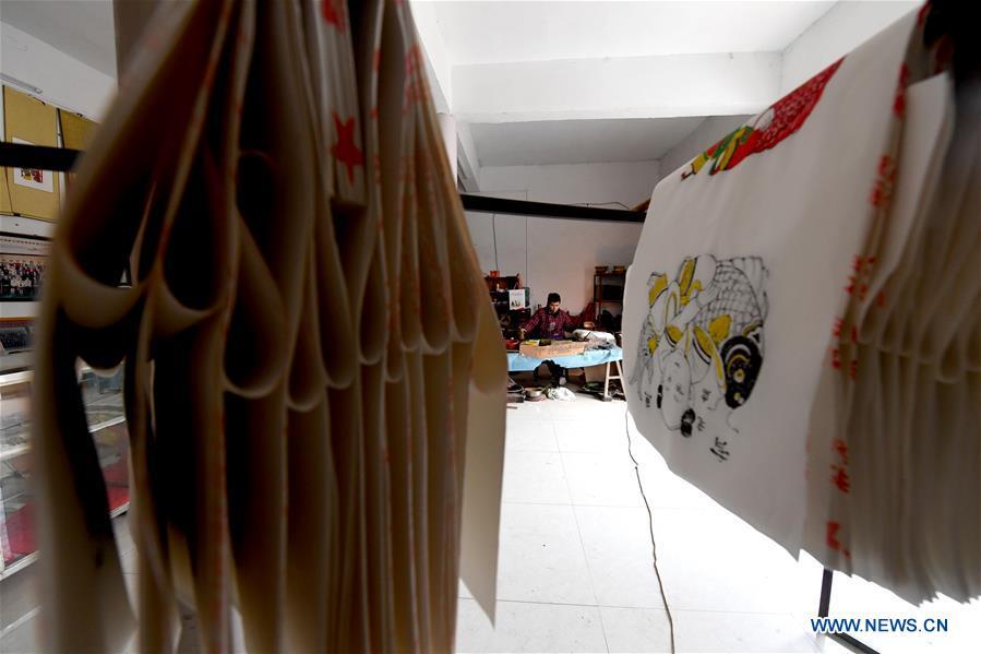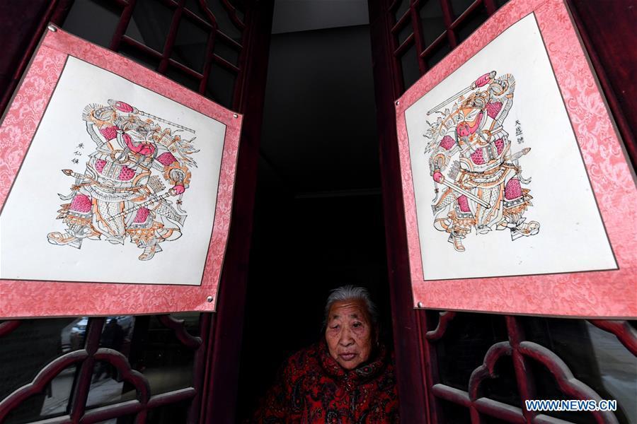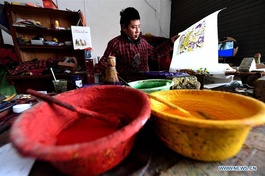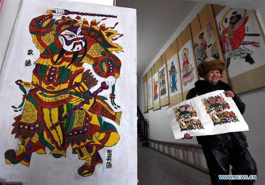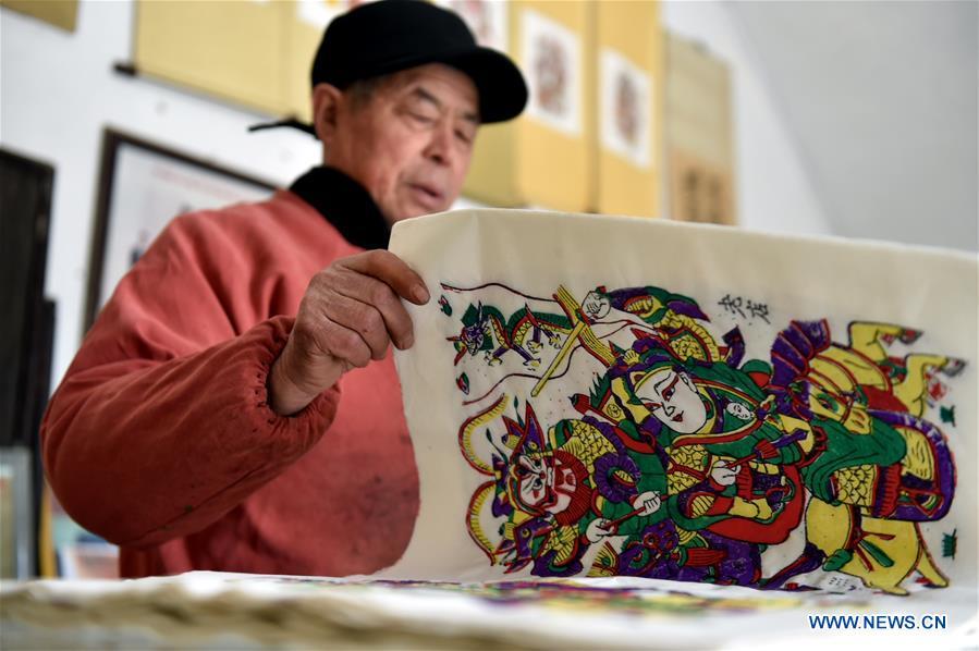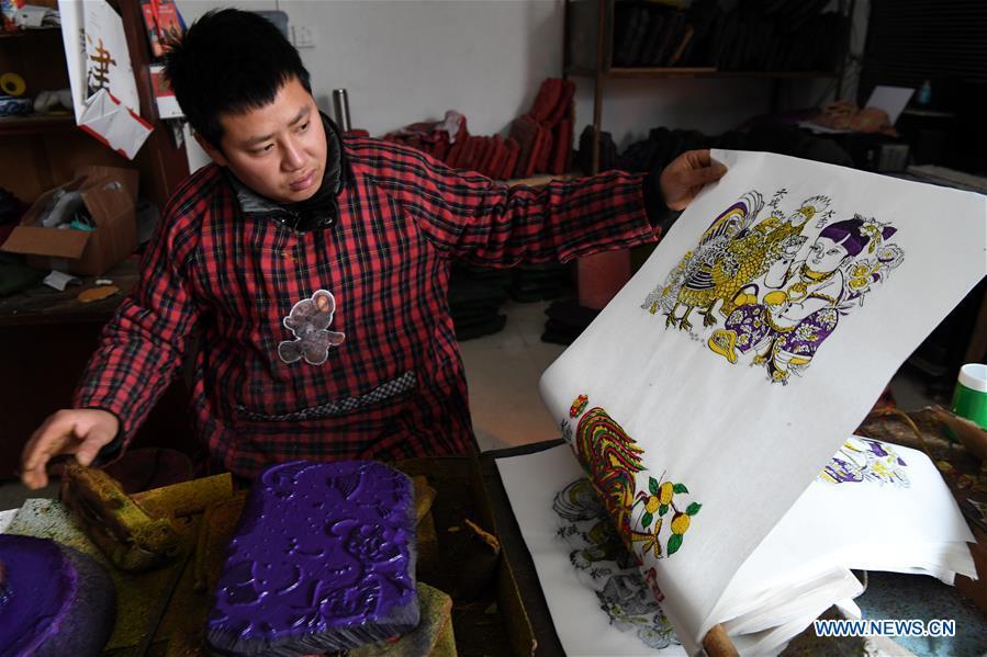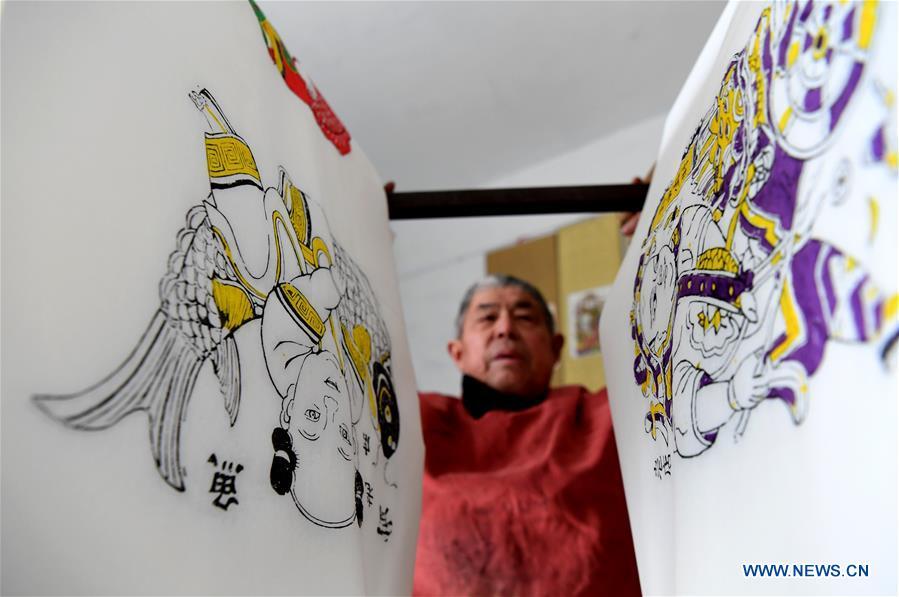 Folk artist Zhang Baode engraves the woodblock for New Year prints in Zhuxian Township of Kaifeng City, central China's Henan Province, Jan. 17, 2018. Zhuxian Township, well known for its traditional New Year-themed woodblock printing art, has seen the busy production of New Year pictures for the upcoming Chinese Spring Festival, which falls on Feb. 16 this year. (Xinhua/Li Jianan)
