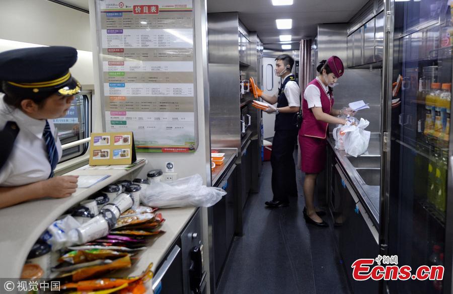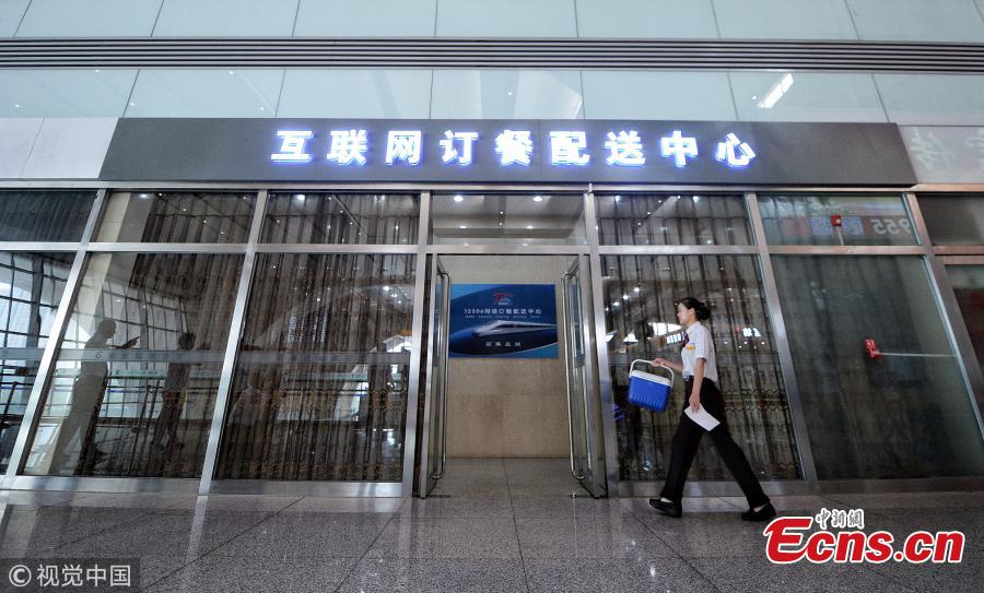 High-speed train staff prepare on-demand food for passengers at a railway station. Passengers on high-speed trains in China can now sample a greater variety of food more quickly than before as the China Railway Corporation has upgraded its online pre-ordering service. Once their ticket is booked, a passenger is now able to order a meal using the rail system’s official ticket-booking website, 12306.cn, or its App, one hour prior to their train departing. Previously, the time limit was two hours. After successfully ordering a meal, the food is delivered to the passenger's seat by train station staff. (Photo/VCG)