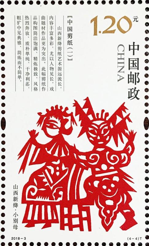 Two stamps demonstrate paper-cutting techniques from Xinjiang county in Shanxi province and Yuxian county in Hebei province respectively, both of which favor motifs borrowed from time-honored local operas.