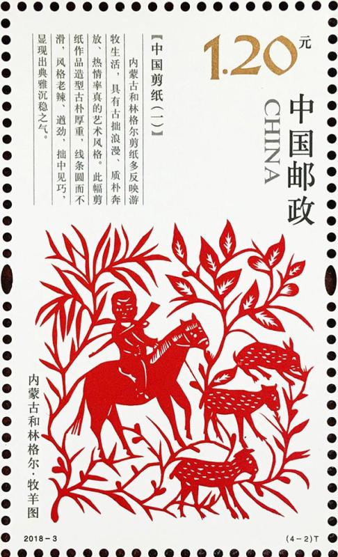 A third stamp shows the scissor art of Heling'er county in the Inner Mongolia autonomous region that portrays everyday life on the grasslands.