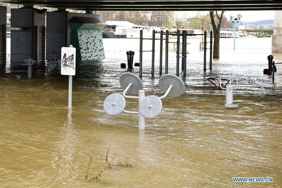 Photo taken on Jan. 23, 2018 shows a flooded road on the bank of the Seine River in Paris, France. French weather agency Meteo France on Tuesday has put 23 departments on orange alert on floods risk. (Xinhua/Chen Yichen)