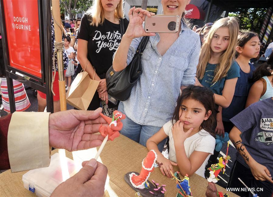 Dragon dancers perform during a celebration for Chinese lunar new year at the Original Farmers Market in Los Angeles, the United States, Jan. 28, 2018. (Xinhua/Zhao Hanrong)