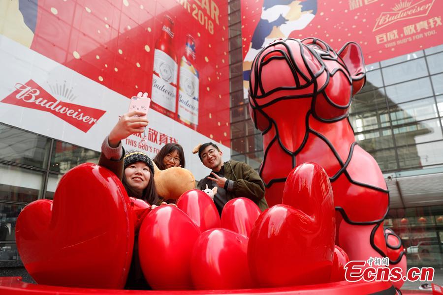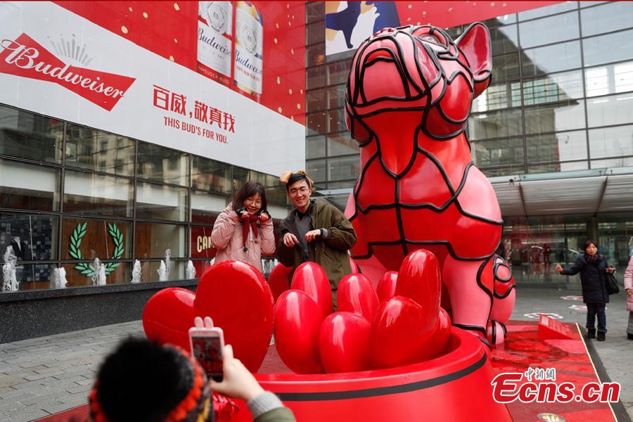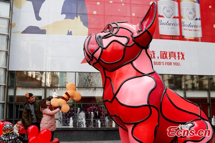 A 5-meter-tall dog-themed installation, created by American artist David Flores, is seen at a shopping mall in Shanghai, Jan. 29, 2018. 2018 is the Year of the Dog in China’s lunar calendar. The installation, which is shaped like a red bulldog, was inspired by the artist's pet dog named Tomodachi. (Photo: China News Service/Zhang Hengwei)