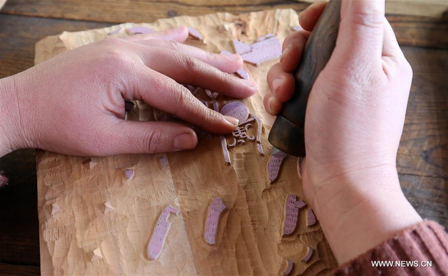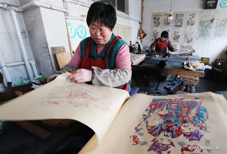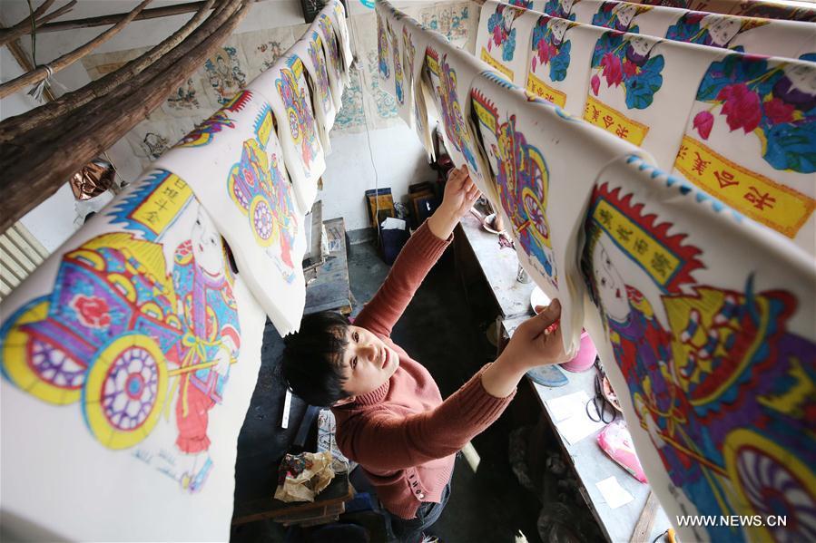 Folk artists dry New Year pictures off in Yangjiabu Village of Hanting District in Weifang, east China's Shandong Province, Jan. 29, 2018, to cope with the demand of festival market. (Xinhua/Zhang Chi)