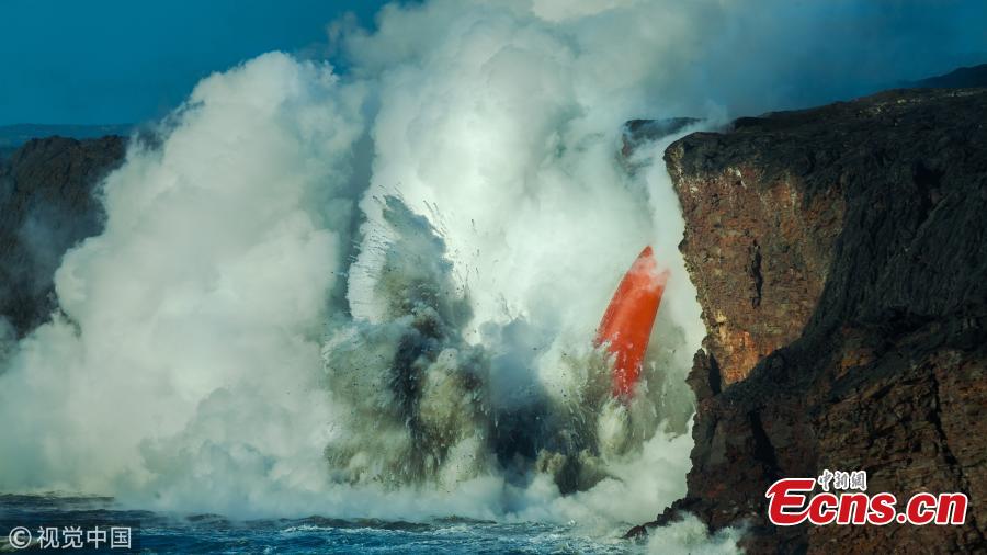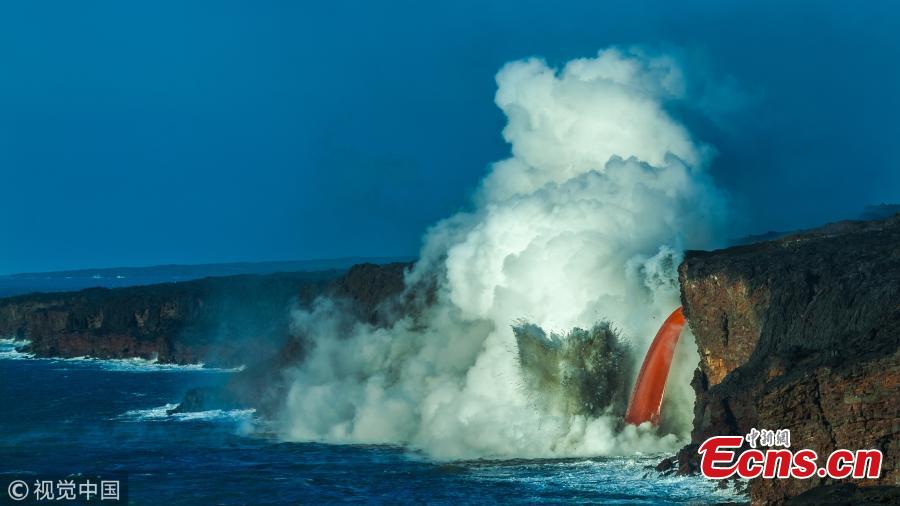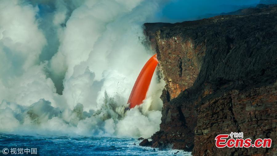 Photo taken by Dhilung Kirat shows lava from the Kilauea Volcano in the Hawaiian Islands flowing into the sea. The "waterfall" was formed after a portion of the Kamokuna lava delta collapsed. (Photo/VCG)