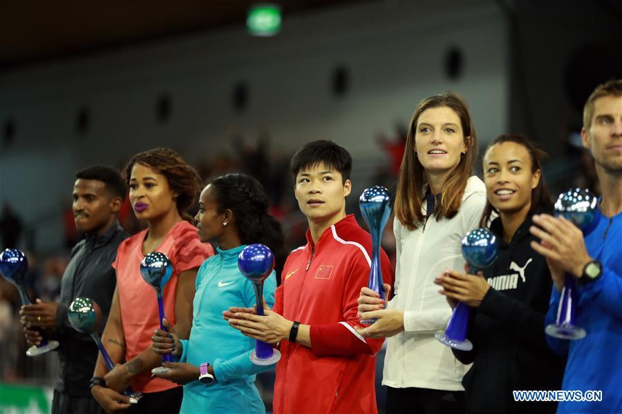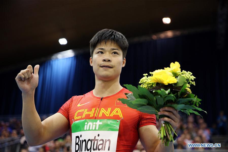 Su Bingtian (2nd R) of China competes during the Men's 60m final of the 2018 IAAF World Indoor Tour in Karlsruhe, Germany, on Feb. 3, 2018. Su Bingtian claimed the title with 6.47 seconds.(Xinhua/Luo Huanhuan)