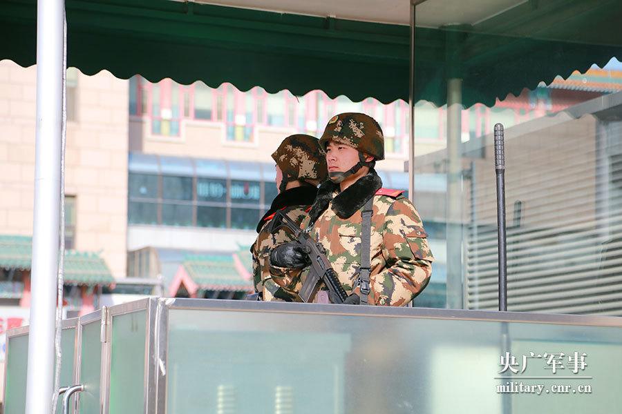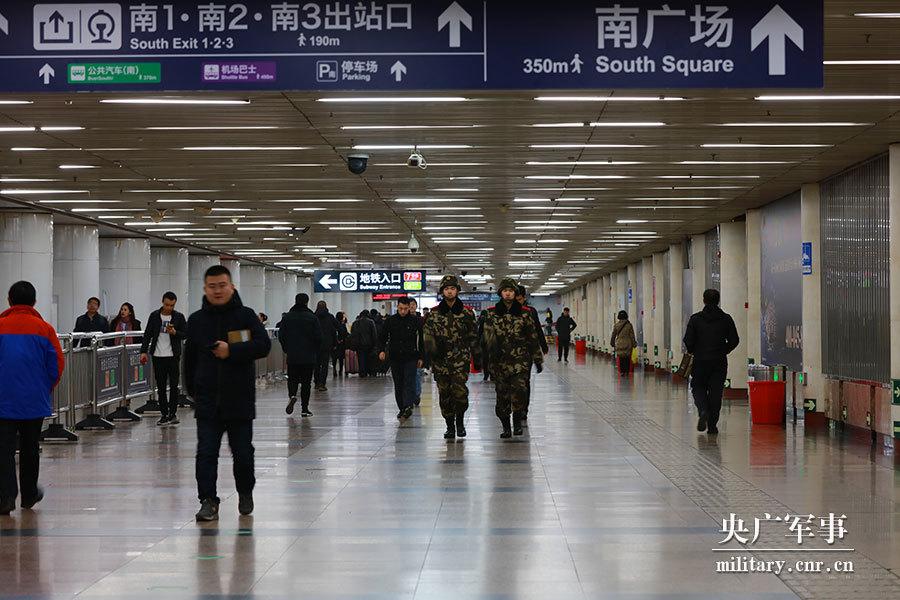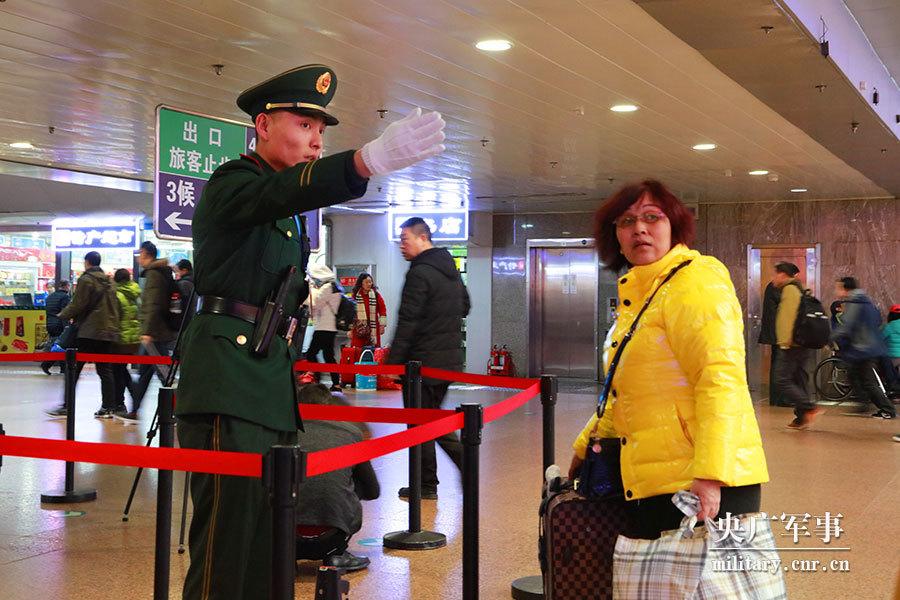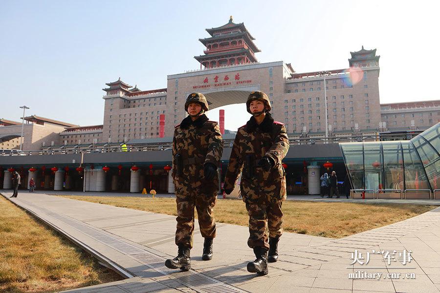 Armed police stand guard at Beijing West Railway Station on February 1, 2018. The soldiers are on duty for eighteen hours a day at the station to ensure passenger safety during this year's Spring Festival travel rush. The travel rush started on February 1, and will last until March 12. (Photo/cnr.cn)