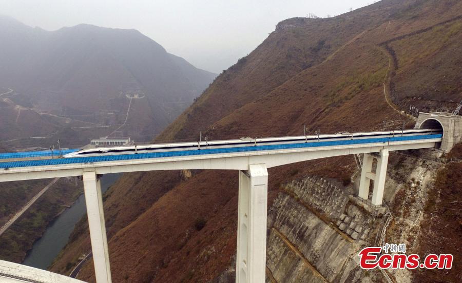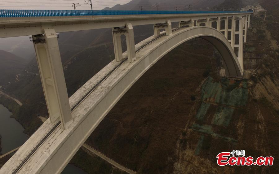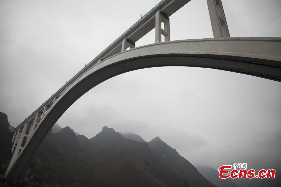 Photo taken in the air shows Beipan River Bridge at the border area of Guanling Autonomous County and Qinglong County in Southwest China’s Guizhou Province, Feb. 4, 2018. The 445-meter span is the longest in the world made with reinforced concrete. At a total length of 721 meters, the bridge is an important structure on the high-speed railway linking Kunming in Yunnan Province with Shanghai. (Photo: China News Service/Qu Honglun)