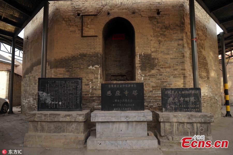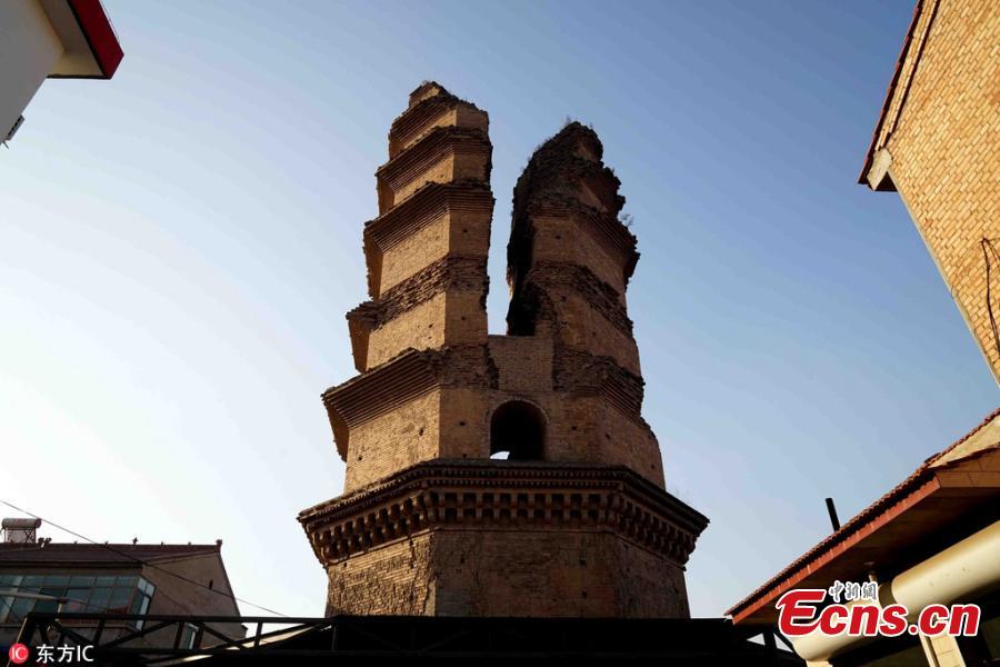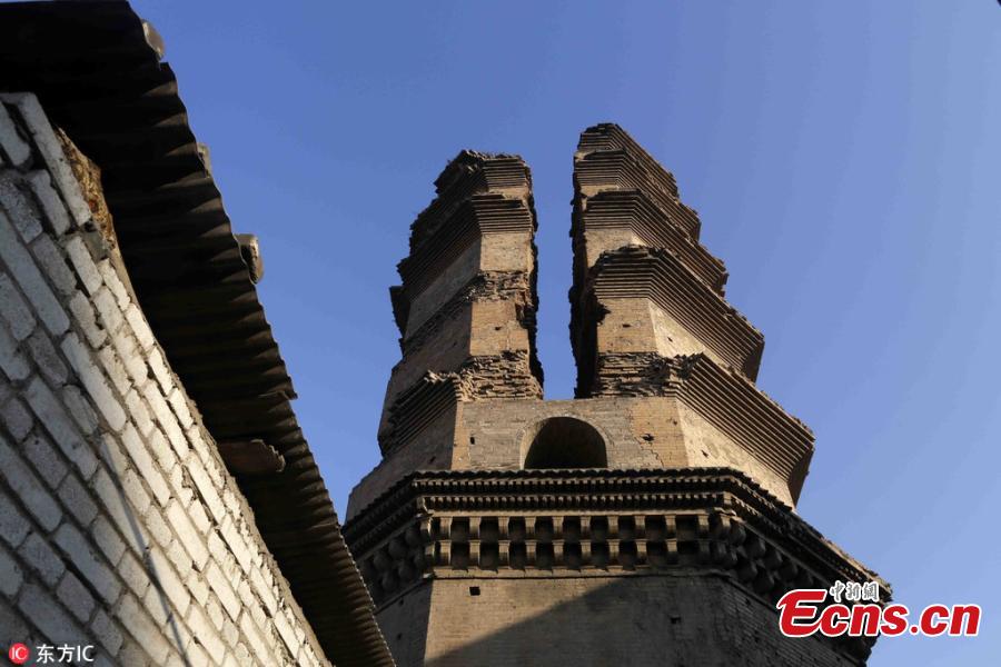 A view of Ganying Temple Pagoda in Quwo County, North China’s Shanxi Province. The brick pagoda, established in 1165 in Song Dynasty, was transformed into two parts from the fourth floor after an earthquake in 1303 of Yuan Dynasty. (Photo/IC)