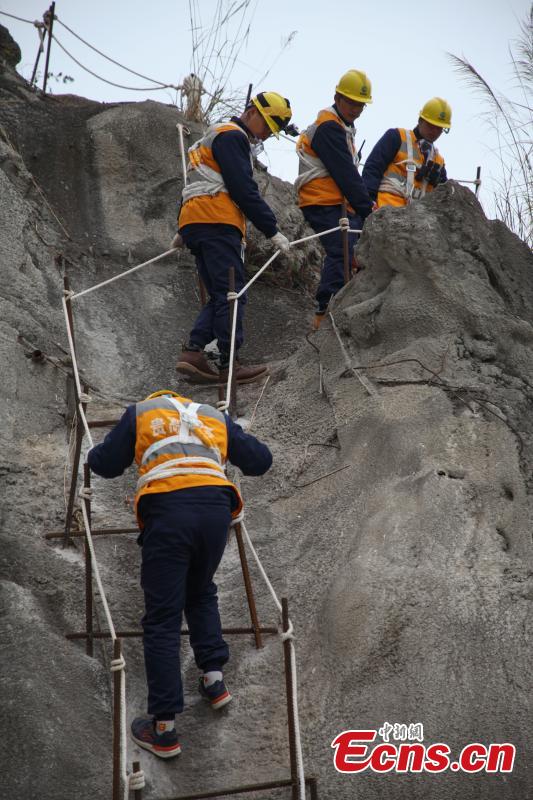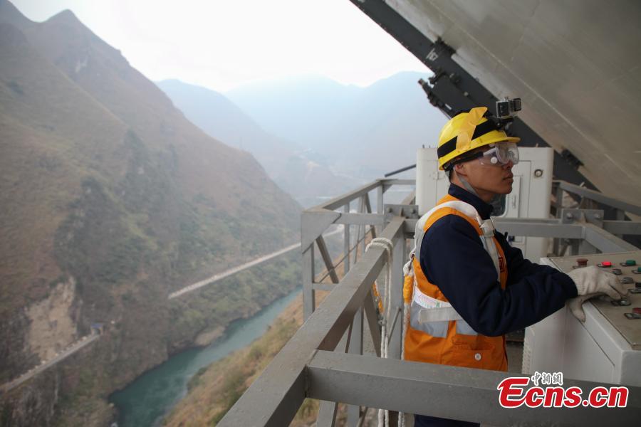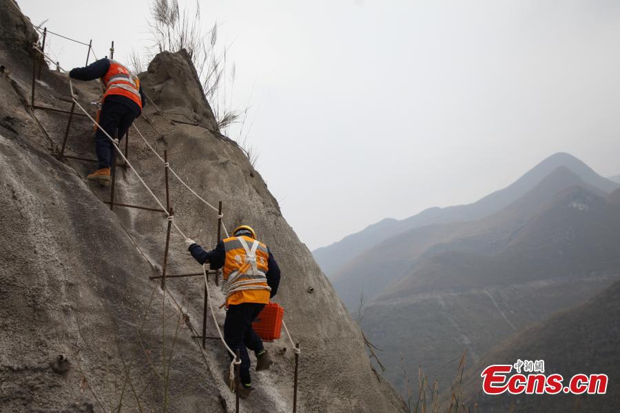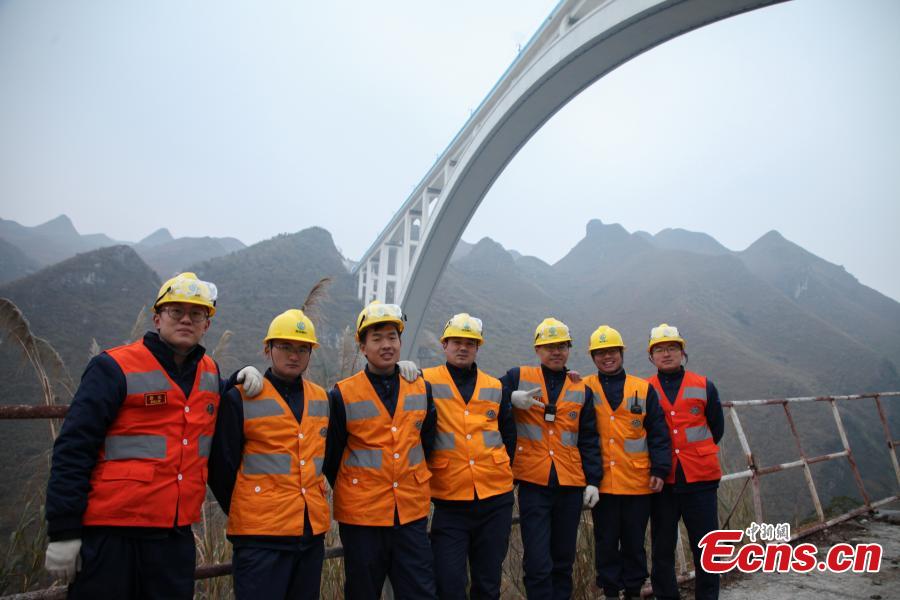 Workers maintain Beipan River Bridge at the border area of Guanling Autonomous County and Qinglong County in Southwest China’s Guizhou Province, Feb. 4, 2018. The 445-meter span is the longest in the world. At a total length of 721 meters, the bridge is an important structure on the high-speed railway linking Kunming in Yunnan Province with Shanghai. Maintenance workers brave the cold to ensure the safety of the bridge during the Spring Festival travel peak. (Photo: China News Service/Qu Honglun)
