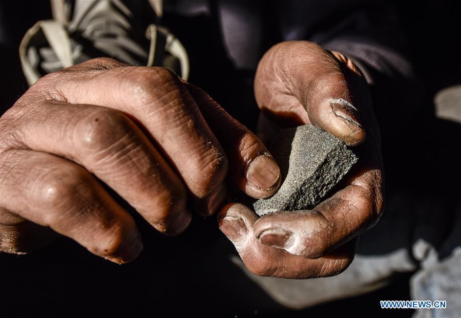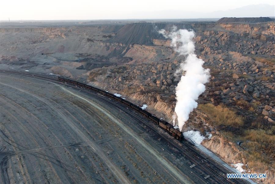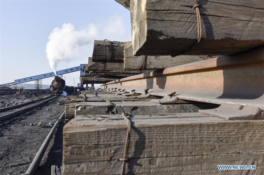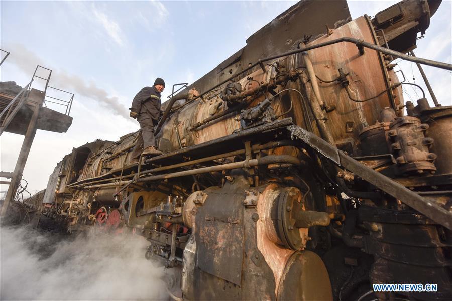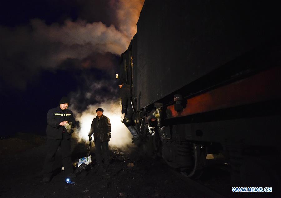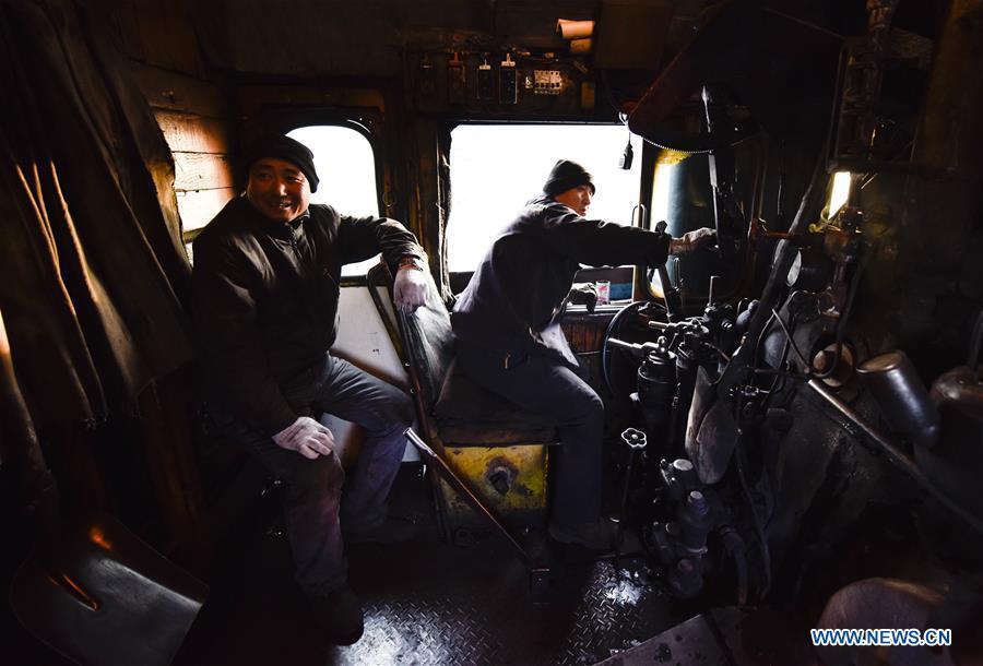 Photo taken on Jan. 19, 2018 shows driver Cheng Zhongyun (L) preparing to work at Sandaoling coal mine area in Hami, northwest China's Xinjiang Uygur Autonomous Region. There were altogether 30 plus steam locomotives running in Sandaoling, a key coal mine area in northwest China's Xinjiang, in the late 1990s, but the number has reduced to only 11 nowadays. Responsible for exploiting and carrying coal in the area, the steam locomotives have been outdated due to the development of science and technology, and will be dismantled once break down since no part can be renewed. However, drivers of the machines have devoted nearly their whole life into the work, keeping loving their job and concentrating in accomplishing their mission. (Xinhua/Zhao Ge)